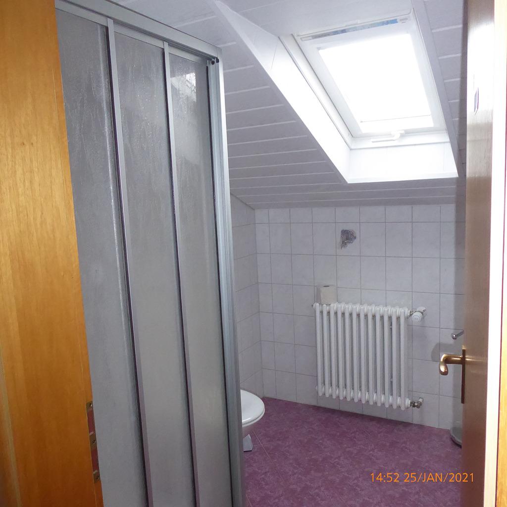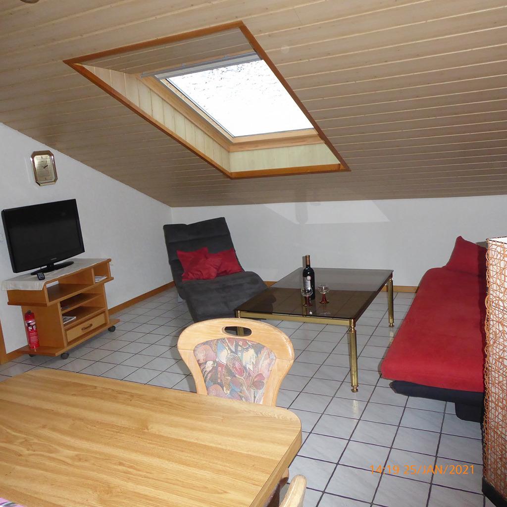 Die Wohnung liegt im Dachgeschoss eines kleinen Dreifamilienhauses und besteht aus zwei Zimmern: ein großes Schlafzimmer mit Arbeitsplatz, einer großen Wohnküche mit Einbauküche und Wohnbereich sowie einem Bad und einem kleinen Flur mit Balkon, der vom Treppenhaus aus zugänglich ist.