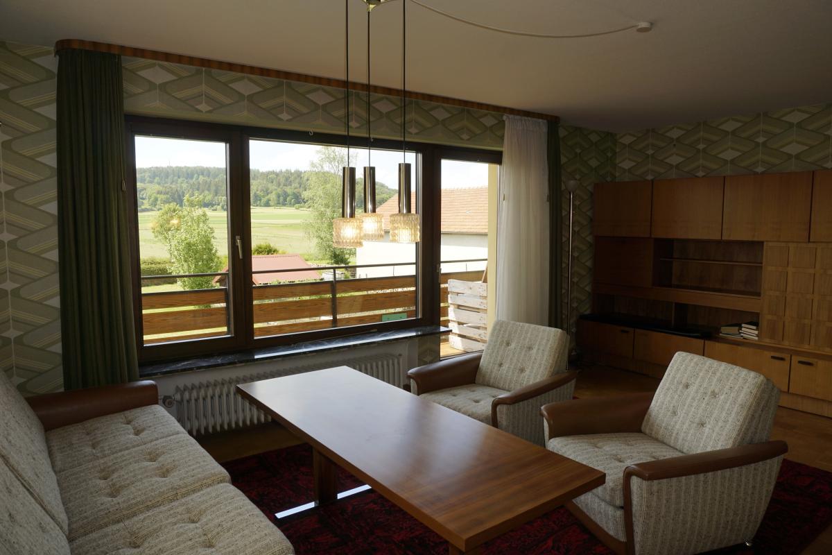 In der Hauptwohnung im EG gibt es 3 Wohn-/Schlagzimmer, ein großes Wohnzimmer, ein Bad mit Dusche und Toilette, ein Esszimmer, eine Küche mit Durchreiche zum Esszimmer und Zugang zum Balkon von drei Zimmern aus!