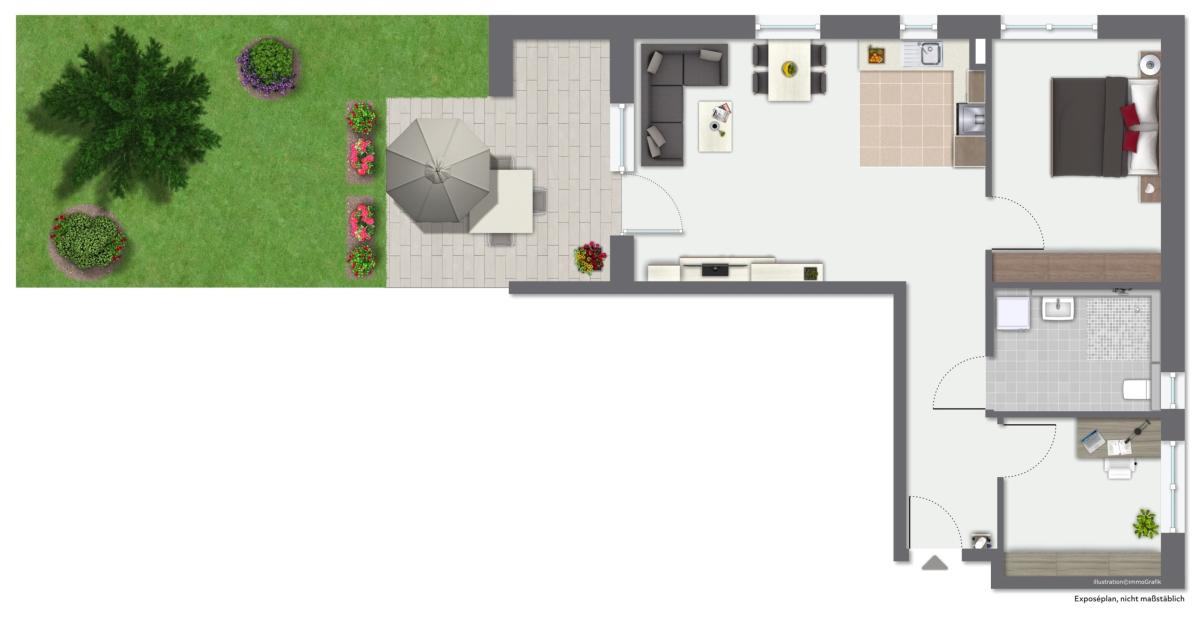 Schon beim Betreten der Wohnung punktet die sie mit ihrem Grundriss - einer komfortablen Eingang- und Flursituation mit ausreichend Platz. Neben 2 praktischen Schlafzimmern ist die hochwertige, voll ausgestattete Einbauküche zu erwähnen. Vom Wohnzimmer aus haben Sie Zugang auf eine großzügige und teilweise überdachte Terrasse mit Blick in den Gartenbereich der Anlage. Die Räume der Wohnung sind mit viel Tageslicht verwöhnt! Außerdem punktet das Bad mit einer bodengleichen Dusche und seiner hochwertigen Ausstattung.
