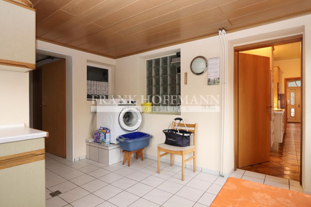 Besonders praktisch ist der direkte Zugang zur Doppelgarage, von der aus Sie in einen ca. 70 m² großen Hobby- oder Partyraum gelangen, der ursprünglich der Kuhstall war. Eine Außentür führt von hier auf die Terrasse. Das Obergeschoss erreichen Sie über eine Holztreppe, die sich im Zwischenflur vor dem Büro befindet.
