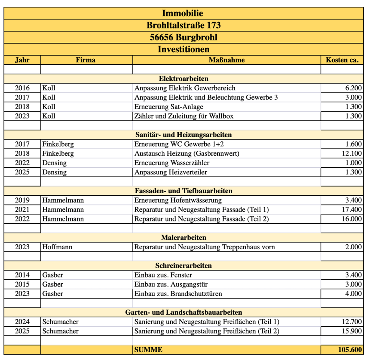 Im Anhang finden Sie eine Aufstellung der Gewerke die seit 2014 saniert wurden. Die Posten unter jeweils 1.000 € wurden bei dieser Aufstellung weggelassen.