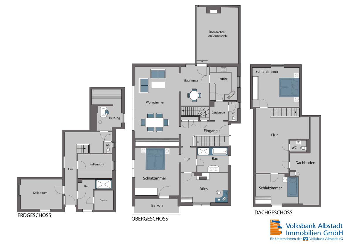 - Der Grundriss und der virtuelle Rundgang sind von der Einliegerwohnung nicht dargestellt. Die Aufteilung der Einliegerwohnung entnehmen Sie bitte dem Baugesuch.