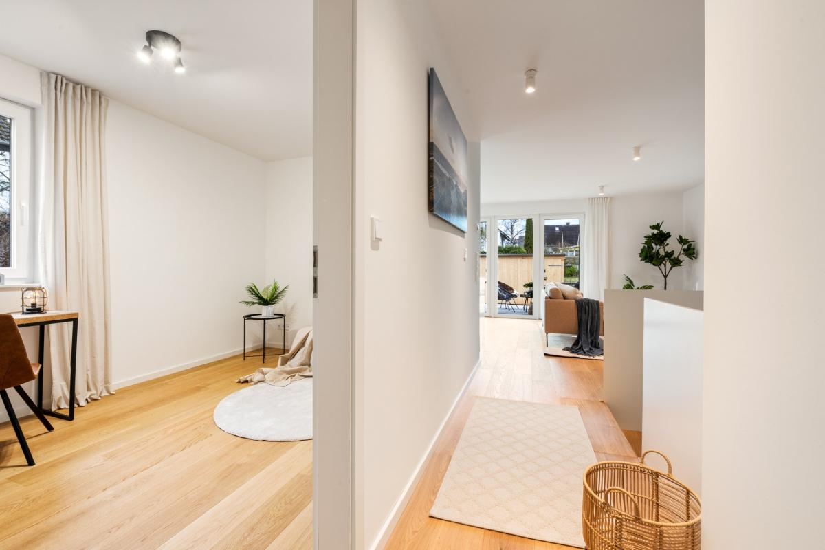 Tageslichtbad mit Dusche, Echtholzparkett (Eiche), Terrasse, Gartenanteil, Personenaufzug, Abstellraum im Untergeschoss, Carport mit Abstellraum