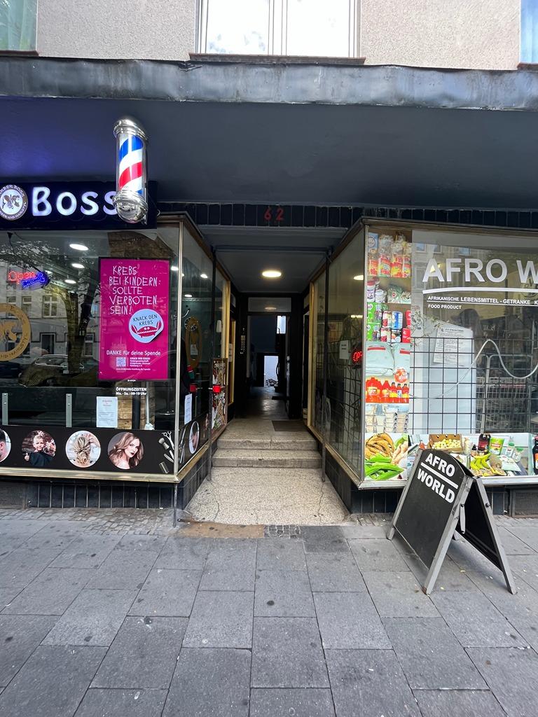 Im Erdgeschoss befinden sich zwei Gewerbeflächen. Auf der linken Seite ist ein Friseursalon untergebracht, während sich auf der rechten Seite ein Geschäft für afrikanische Waren befindet.