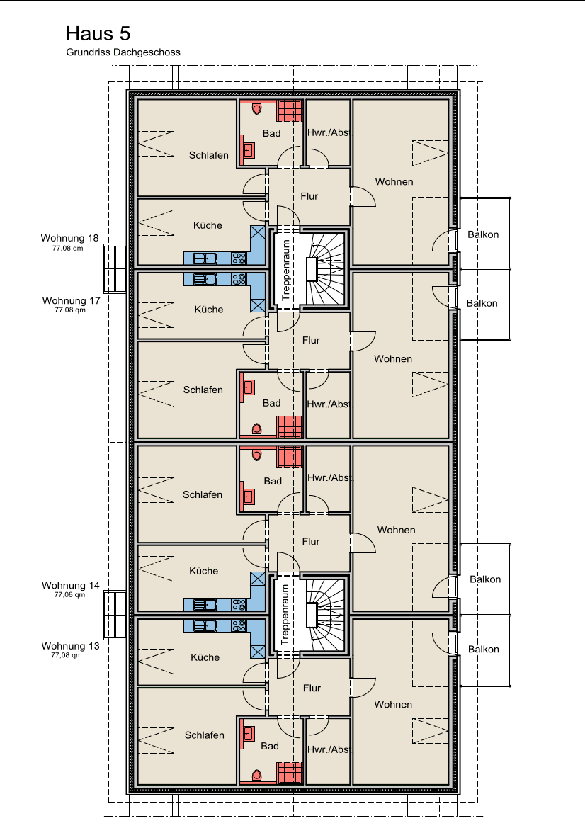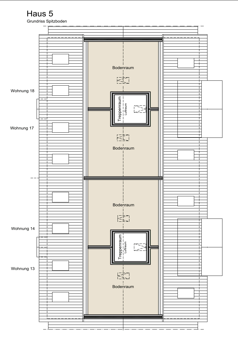 Die Räumlichkeiten im Dachgeschoss (Ausnahme sind die WE 13, 14, 17 und 18, die im Dachgeschoss des mittleren Riegels belegen sind) bieten die Option des weiteren Ausbaus, der anliegenden Baubeschreibung können Sie verschiedene Varianten von Ausbaustufen entnehmen.