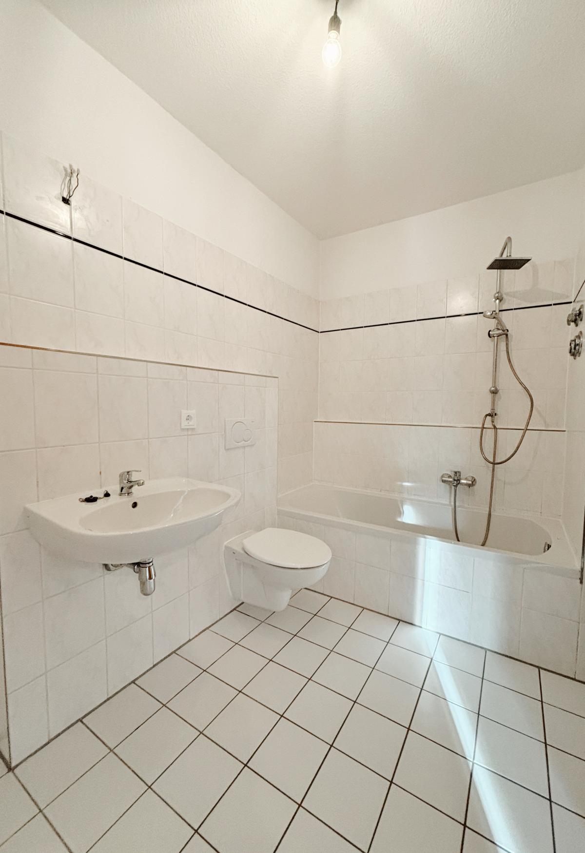 Das Badezimmer ist mit stilvollen Fliesen ausgestattet und bietet eine Badewanne – ideal für entspannende Momente.