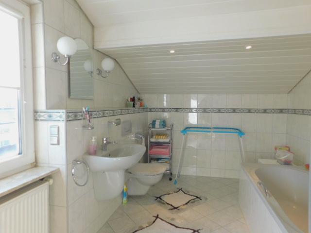 Die gefliesten Bäder verfügen über Badewanne, Dusche, Toilette, Handwaschbecken und Tageslichtfenster.