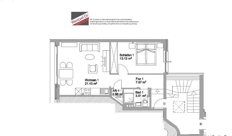 Lichtdurchflutetes im Jahr 2020 ausgebautes Dachgeschoss. Die Wohnung ist ausgestattet mit einer modernen offenen Einbauküche, Duschbad mit Tageslicht durch Lichtkuppel, bodentiefen Fenstern, die Wohnräume sind mit einem hellen Designboden versehen. Die Decken im Flur und Bad verfügen über Downlights. Ferner ist ein kleiner Abstellraum mit Waschmaschinenanschluss vorhanden. Ein Keller/oder Bodenraum ist nicht vorhanden.