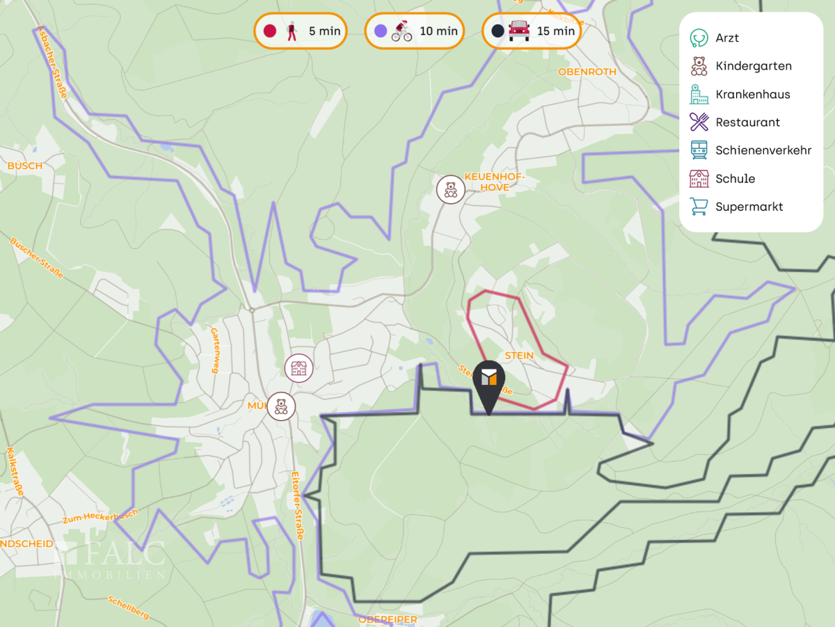 Die Immobilie befindet sich in einer ruhigen und grünen Wohngegend von Eitorf, einem charmanten Ort, der für seine ländliche Idylle und gleichzeitig gute Erreichbarkeit geschätzt wird. Die Nachbarschaft besteht überwiegend aus gepflegten Einfamilienhäusern, was eine harmonische und familiäre Atmosphäre schafft. Dank der durchdachten Bebauung bietet das Wohngebiet viel Privatsphäre und Ruhe, während gleichzeitig eine ausgezeichnete Anbindung an die Natur und die notwendige Infrastruktur gegeben ist.
