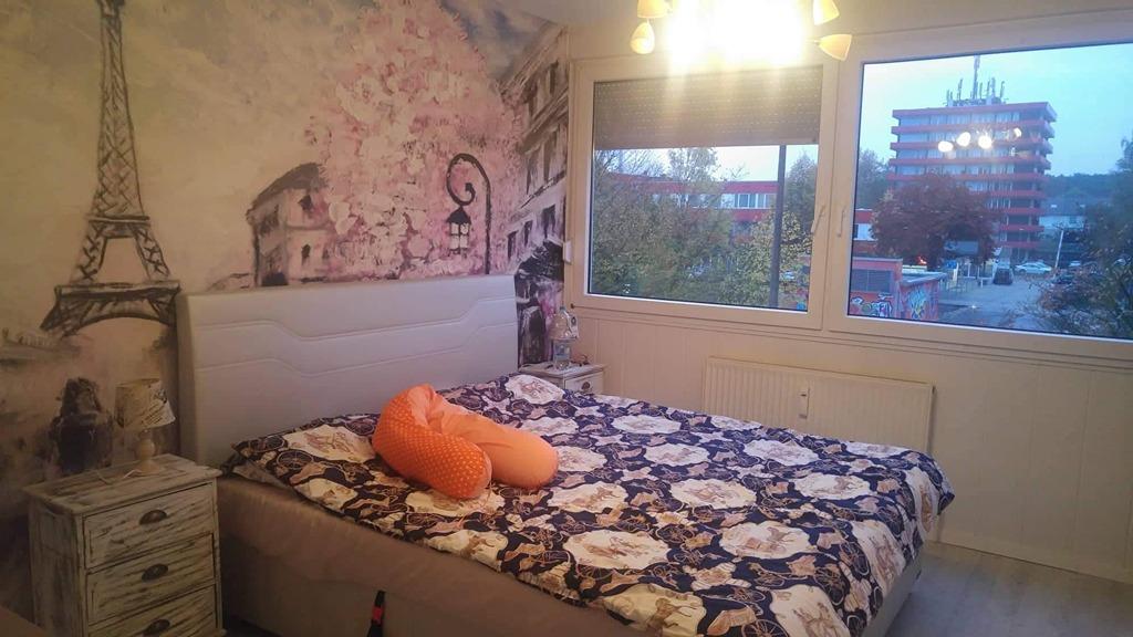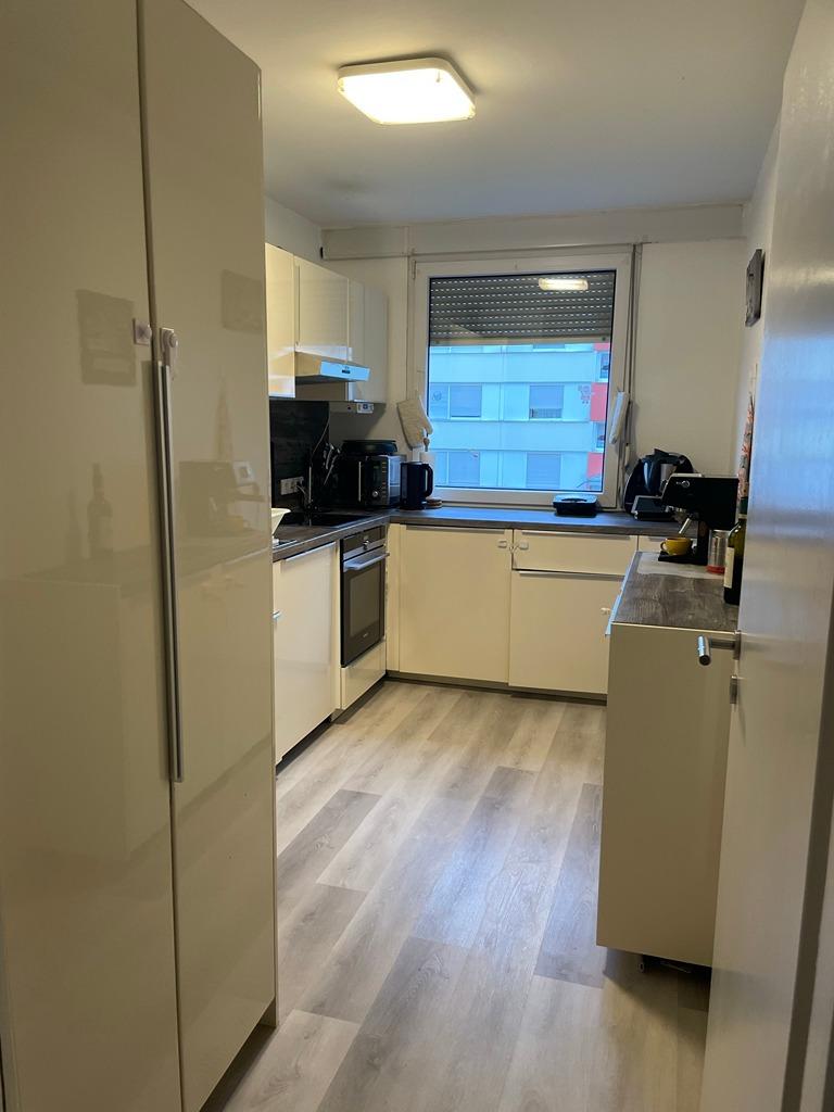 Der Flur führt Sie zur Küche, die mit einer modernen Einbauküche ausgestattet ist. Dank einer breiten Fensterfront findet sich hier Tageslicht. Den Balkon mit schönem Ausblick auf die benachbarte Grünanlage. Zwei weitere Zimmer bieten Paaren mit oder ohne Kind