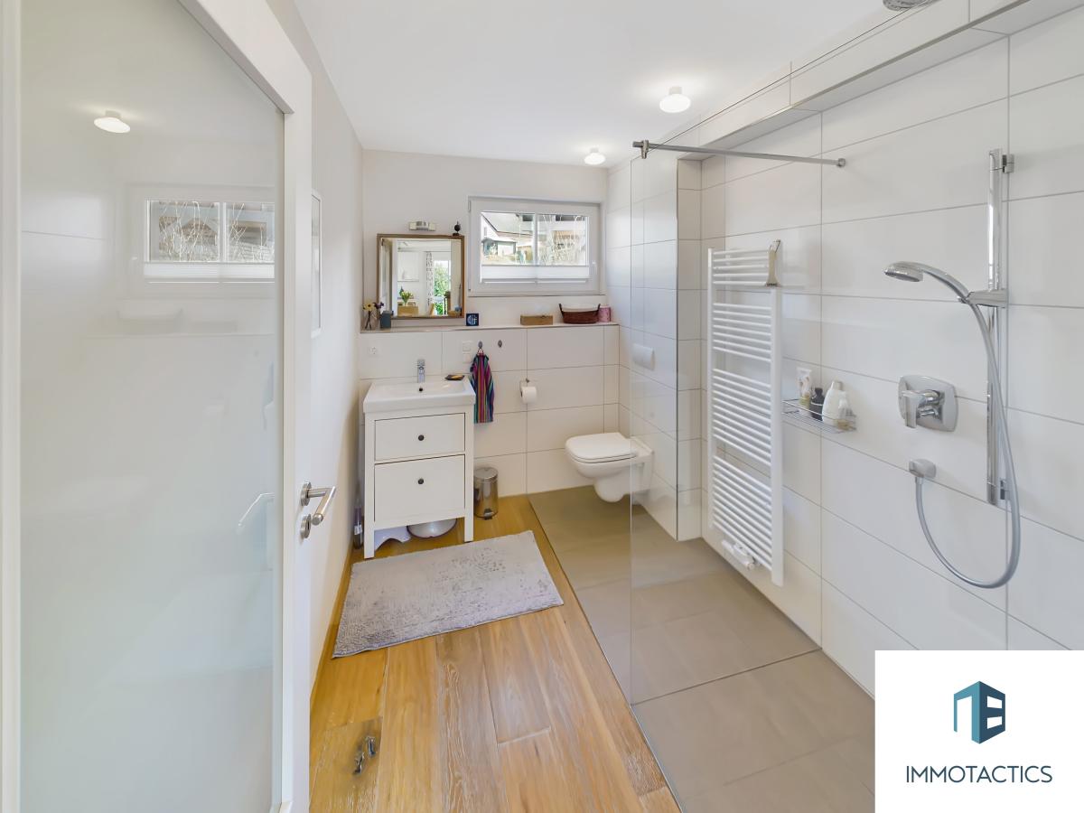 Im Erdgeschoss befinden sich zudem ein flexibles Büro oder Gästezimmer sowie ein modernes Badezimmer. Ergänzt wird die Etage durch einen Heizungsraum mit moderner Pelletheizung.