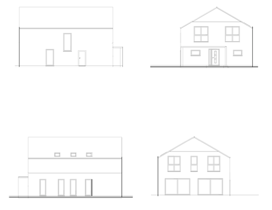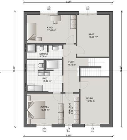 Das Gebäude wurde mit einem modernen Satteldach (Dachneigung 25°) ohne Dachüberstand errichtet und verfügt im Erdgeschoss über eine erhöhte Deckenhöhe von ca. 2,90 m (je nach Bodenaufbau). Passend dazu sind die Fenster und Türen im Erdgeschoss ebenfalls erhöht, was für ein großzügiges und helles Raumgefühl sorgt. Im Obergeschoss finden Sie gemütliche Räume mit leichten Dachschrägen und einem Kniestock von ca. 2,00 m, die Ihnen viel Stellfläche und Kopffreiheit bieten.