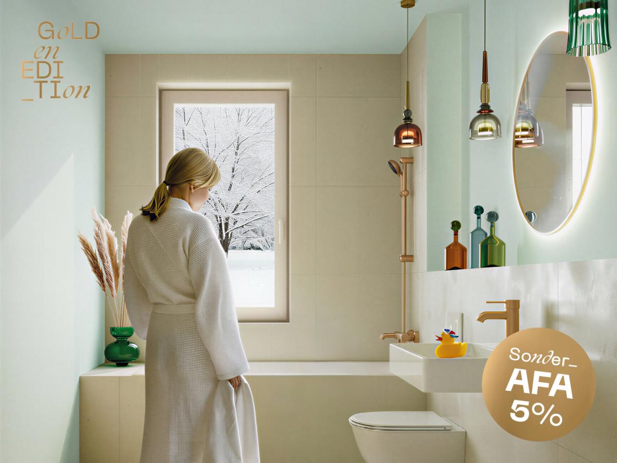 - Bäder mit großformatigen Fliesen und wahlweise optischen Highlights in 3-D-Optik