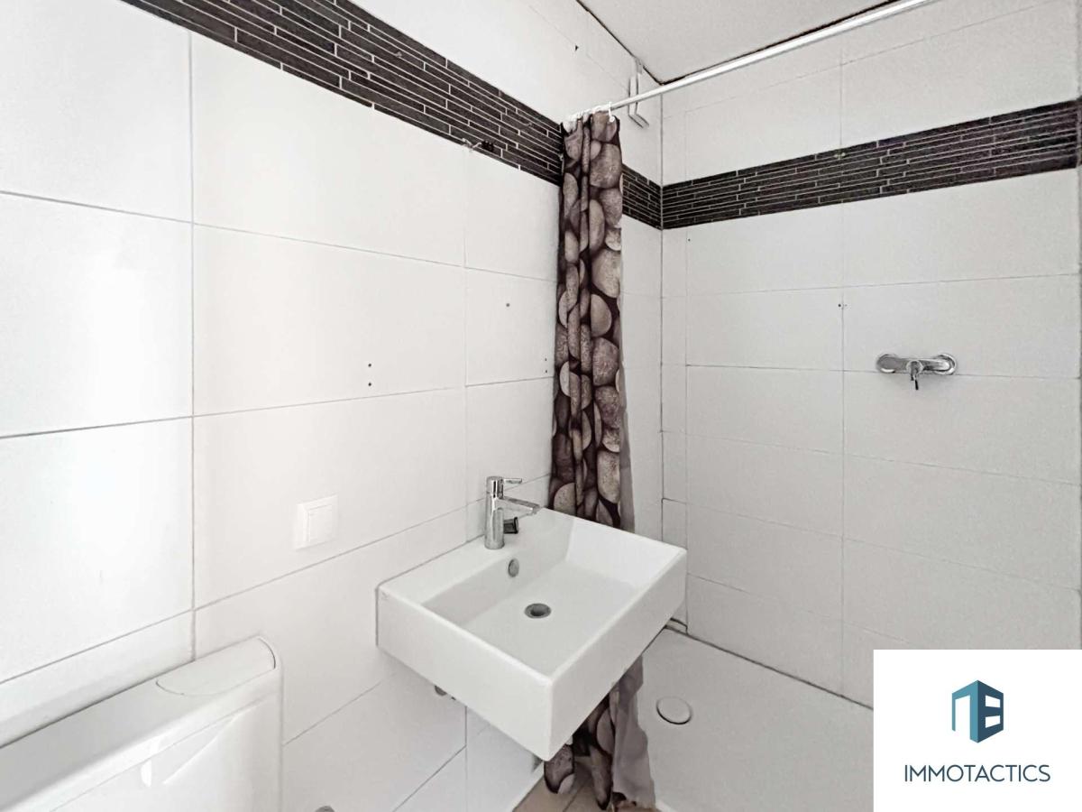 Die Küche ist separat zugänglich, mit Fenster und praktischer Größe – ideal für alle, die gerne frisch und bei Tageslicht kochen. Das Badezimmer ist funktional ausgestattet mit Dusche, Waschbecken und WC. Klassische Fliesen machen es pflegeleicht.