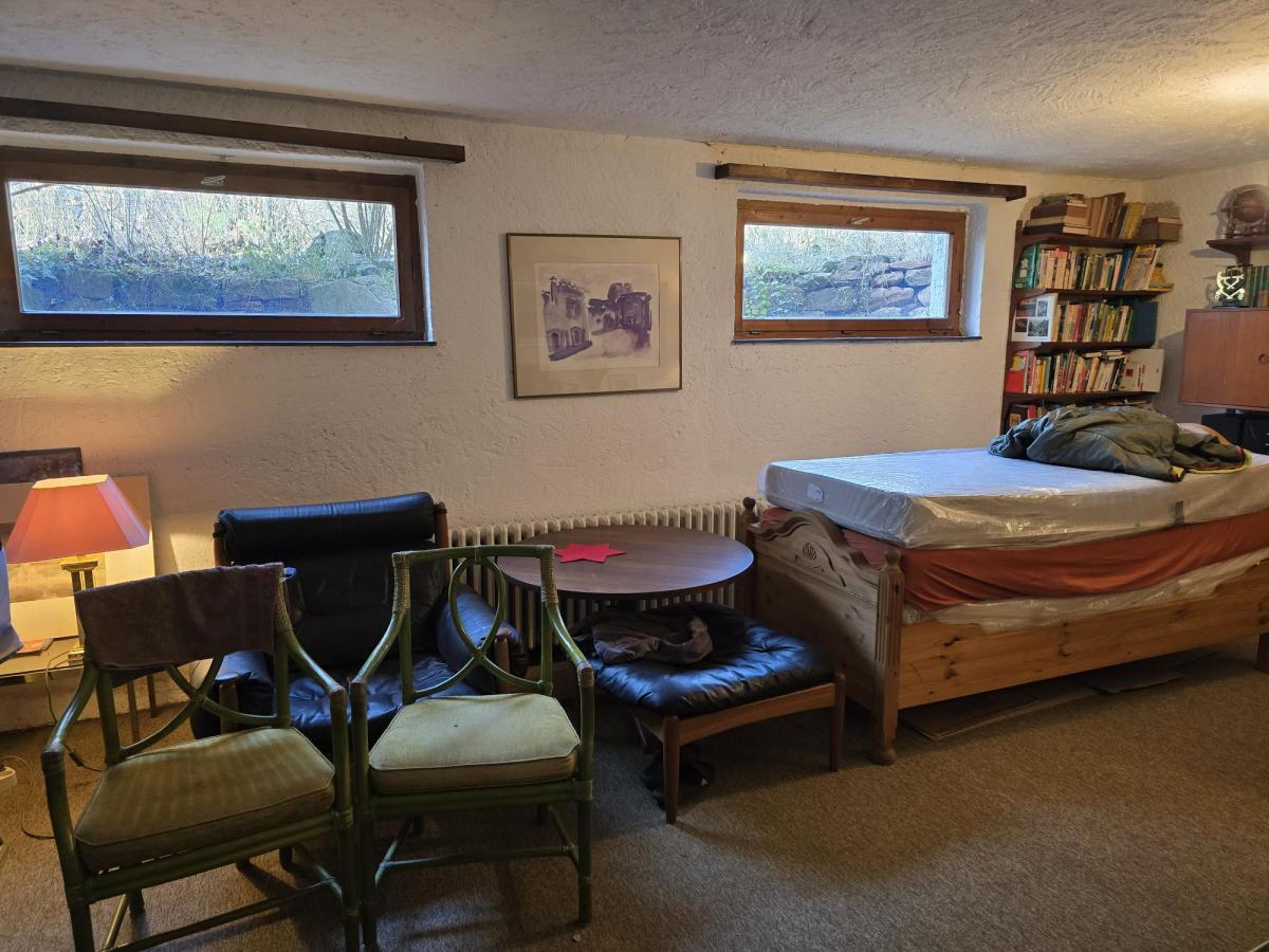 Ergänzt wird das Raumangebot durch 3 Räume in der Teilunterkellerung des Hauses, die durch einen Außenzugang erreichbar sind. Hier finden sich ein großer Hobbyraum mit viel Tageslicht sowie 2 weitere Räume, wovon ein Raum mit einer Toilette ausgestattet ist. Abgerundet werden die als Souterrain ausgebildeten Räumlichkeiten durch einen Heizungskeller mit einer Viessmann-Ölzentralheizung und 2 Kunststofftanks mit je 2.000 Liter Tankinhalt. Der Zugangsbereich des Blockhauses wird durch ein weit ausladendes Schleppdach mit einer ca. 30 m² großen Abstellfläche abgeschirmt.