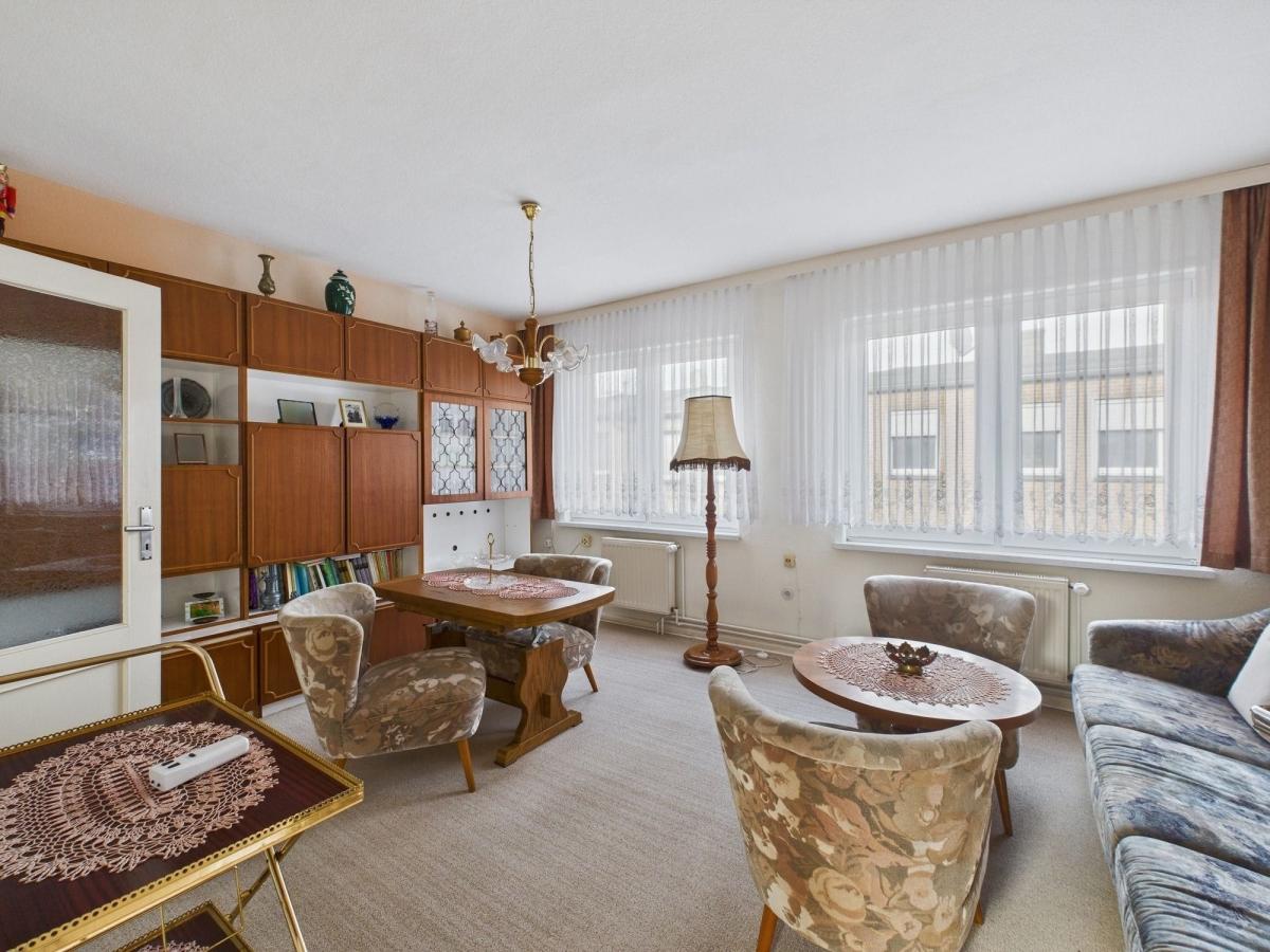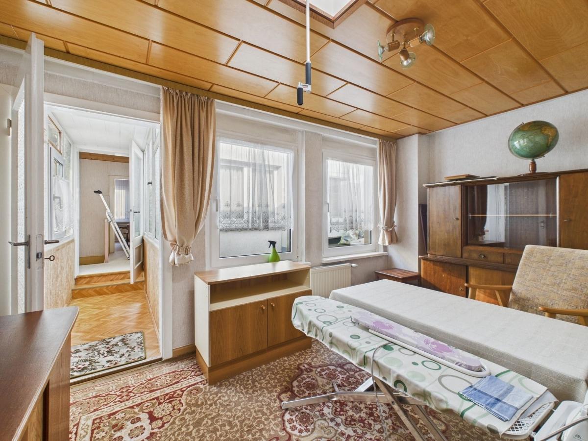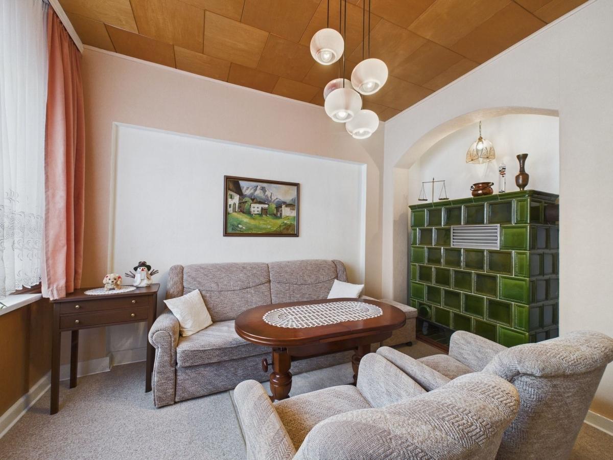 Das großzügige Wohnzimmer im Erdgeschoss ist mit Teppichboden, Holzvertäfelung an der Decke und einem eindrucksvollen grünen Kachelofen ausgestattet, der über die angrenzende Küche beheizt wird. Die Küche verfügt über einen PVC-Bodenbelag und eine helle Holzvertäfelung sowie eine ältere Einbauküche. Die Küche hat einen Zugang zu einem gefliesten Durchgang, in dem sich die Heizungsanlage (Erdgas) befindet. Dieser hat einen Ausgang zum kleinen, gepflasterten Innenhof.