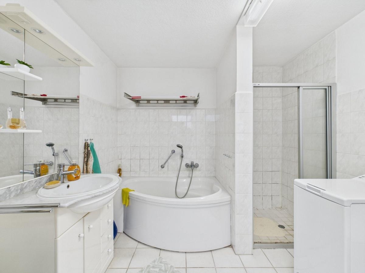 Über den Durchgang erreicht man das hell geflieste Vollbad mit Dusche, Wanne und Waschmaschinenanschluss.