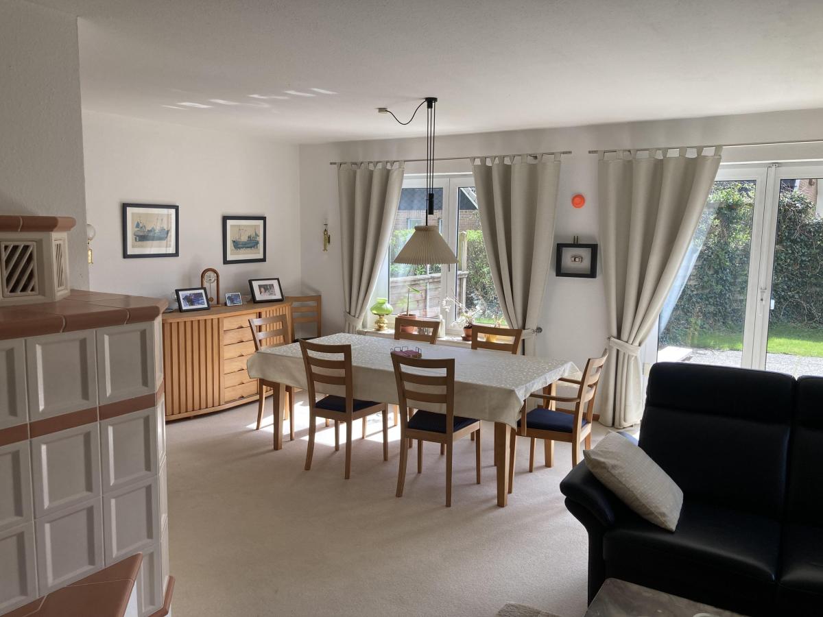 Im Erdgeschoss dieser Immobile befindet sich neben dem Windfang und der Diele das großzügig geschnittene Wohn- und Esszimmer. Hier sorgt ein echter Kachelofen, dessen Feuerspiel auch in der Diele sichtbar ist – für wohlige Wärme und eine gemütliche Atmosphäre. Von hier gelangt man auf die nach Süd-Osten ausgerichtete Terrasse.