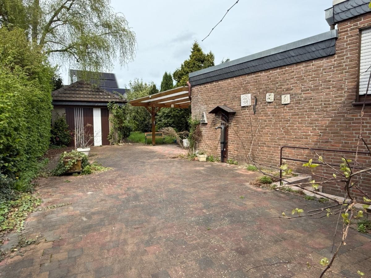 Gepflasterte Einfahrt, Garage, überdachte Terrasse, eingefriedete Gartenanlage, kleines Gartenhaus, Saunahaus
