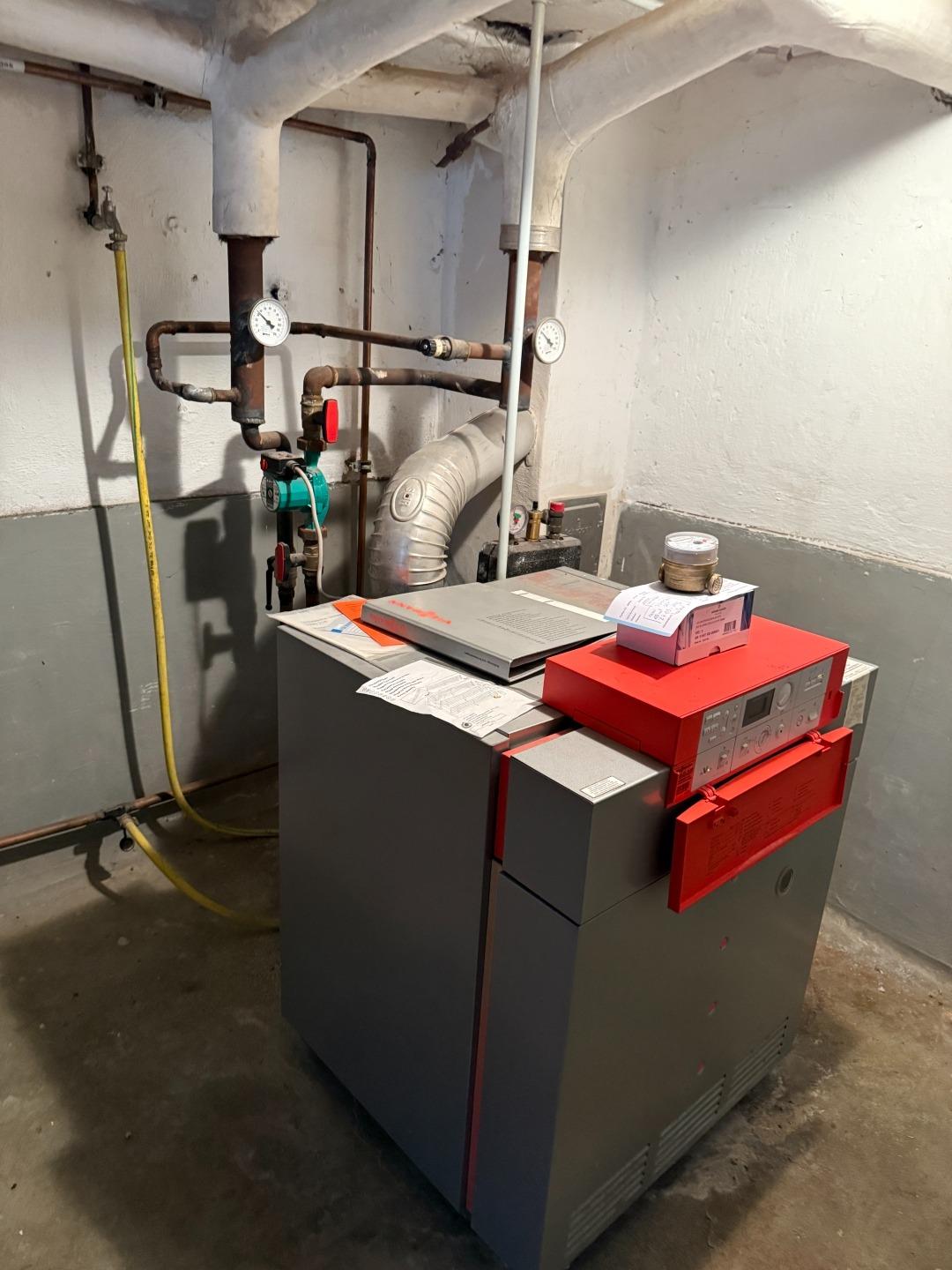 Das Haus ist voll unterkellert (ausgenommen der Anbau). Der Keller präsentiert sich im ursprünglichen Zustand mit bauzeittypischen Merkmalen. Die 2001 installierte Gas-Zentralheizung von Viessmann versorgt das Haus mit Wärme, die Warmwasserbereitung erfolgt über Elektroboiler.
