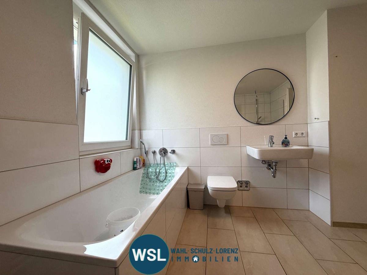 Sanitär: Bad mit Badewanne, bodenebene Dusche, WC, Waschbecken, Waschmaschinenanschluss und Fenster;