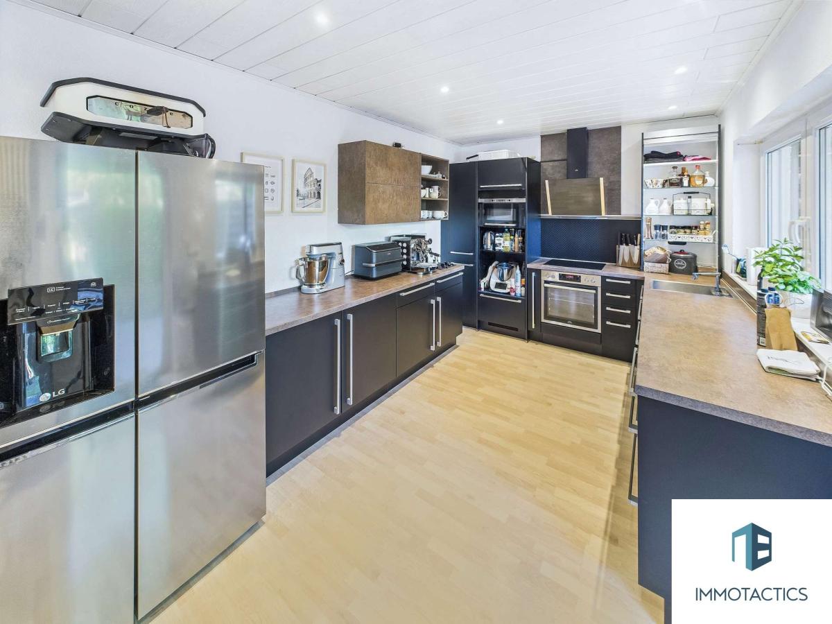 Die moderne Einbauküche (2019) ist im Kaufpreis enthalten und bietet neben hochwertigen Geräten auch viel Platz für die ganze Familie. Von hier aus gelangen Sie direkt auf eine kleinere, überdachte Terrasse mit Grillplatz – perfekt für gesellige Abende.