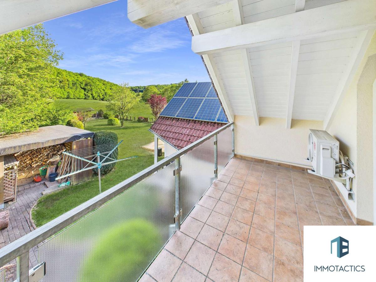 Im Obergeschoss befindet sich zudem das großzügige Elternschlafzimmer mit Zugang zum Balkon und einem traumhaften Ausblick über Felder und Wald. Für zusätzlichen Komfort sorgt die fest installierte Klimaanlage, die selbst in heißen Sommernächten für angenehme Temperaturen sorgt.