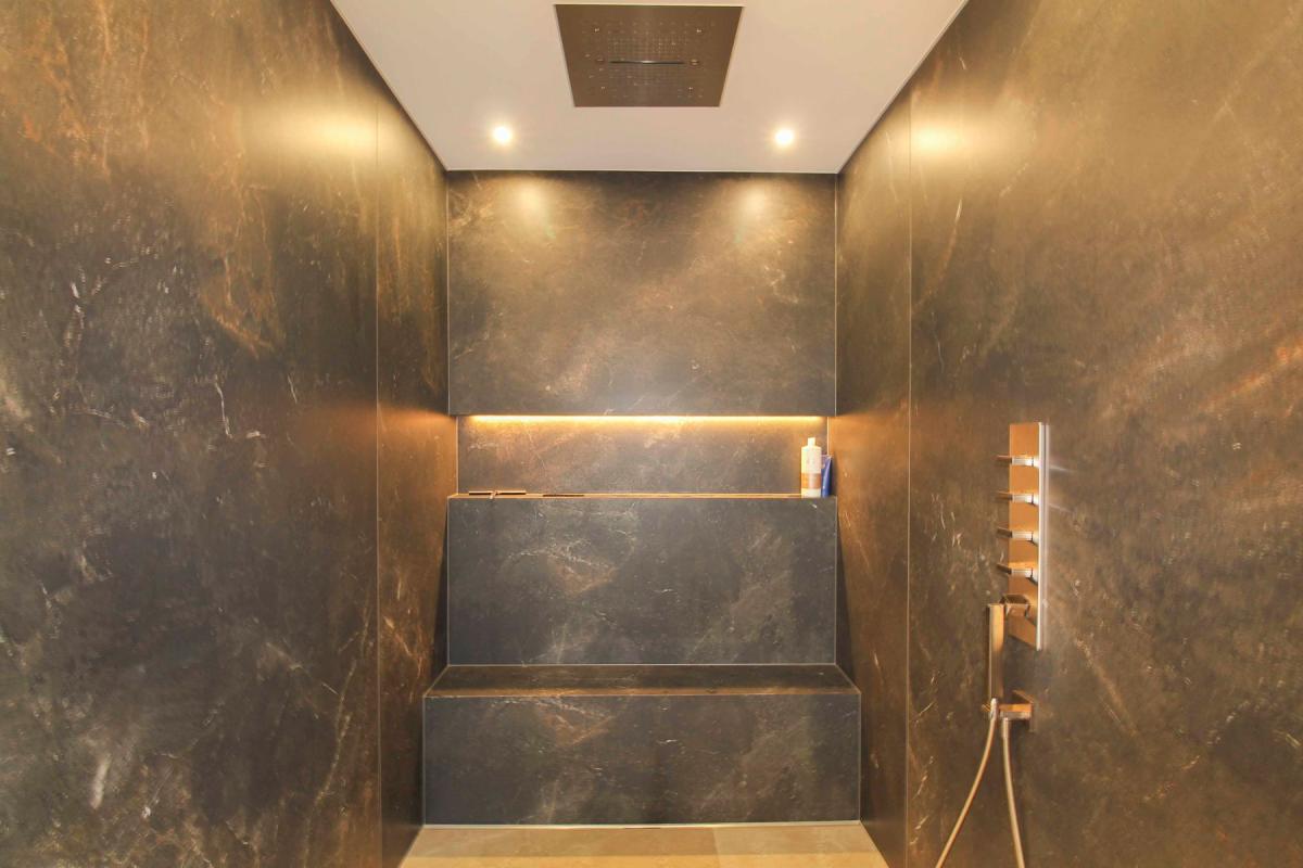 Das Obergeschoss bietet zwei Schlafzimmer und ein Büro. Der Wohn- und Essbereich ist mit einem weiteren Kamin ausgestattet und verfügt über eine hochwertige Küche. Er überzeugt durch die hohe Decke sowie den Zugang zur Dachterrasse. Das exklusive Badezimmer im Obergeschoss bietet eine bodengleiche Dusche, eine Badewanne und einen Waschmaschinenanschluss. Ein Einbauschrank im Flur sorgt für zusätzlichen Stauraum. Das Gäste-WC ist ebenfalls mit einer Dusche ausgestattet.