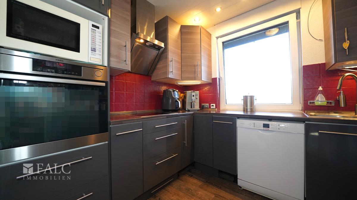 Ihre Küche in elegantem Schwarz, gepaart mit rotem Fliesenspiegel, ist voll ausgestattet und bietet alles, was Sie zum Kochen, Backen und Ausprobieren benötigen. Ausreichend Stauraum, eine großzügige Kühl- und Gefrierkombination, ein Edelstahl-Spülbecken, eine Spülmaschine, ein Backofen auf Körperhöhe und ein leistungsstarkes Cerankochfeld mit passendem Dunstabzug lässt das Koch- und Backherz höher schlagen und verbleibt in der Immobilie.