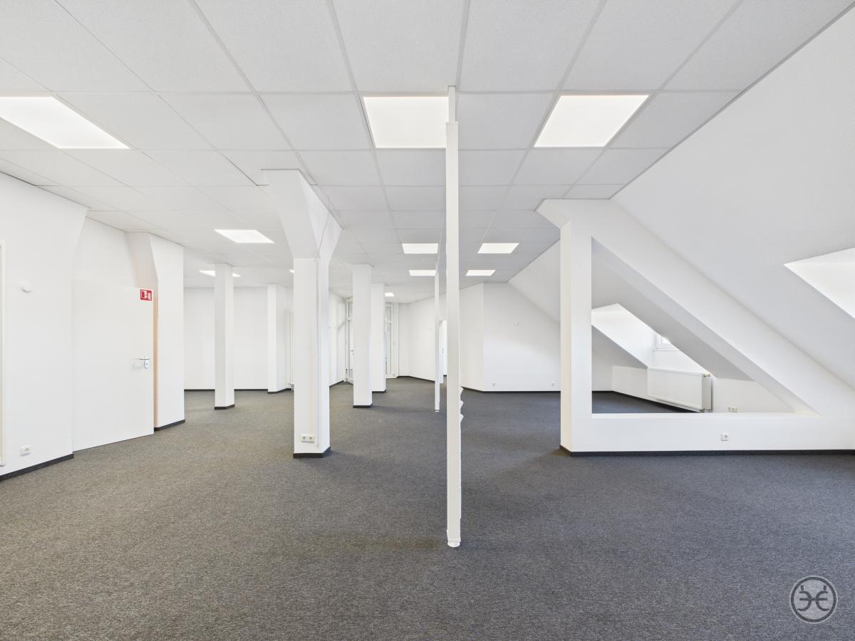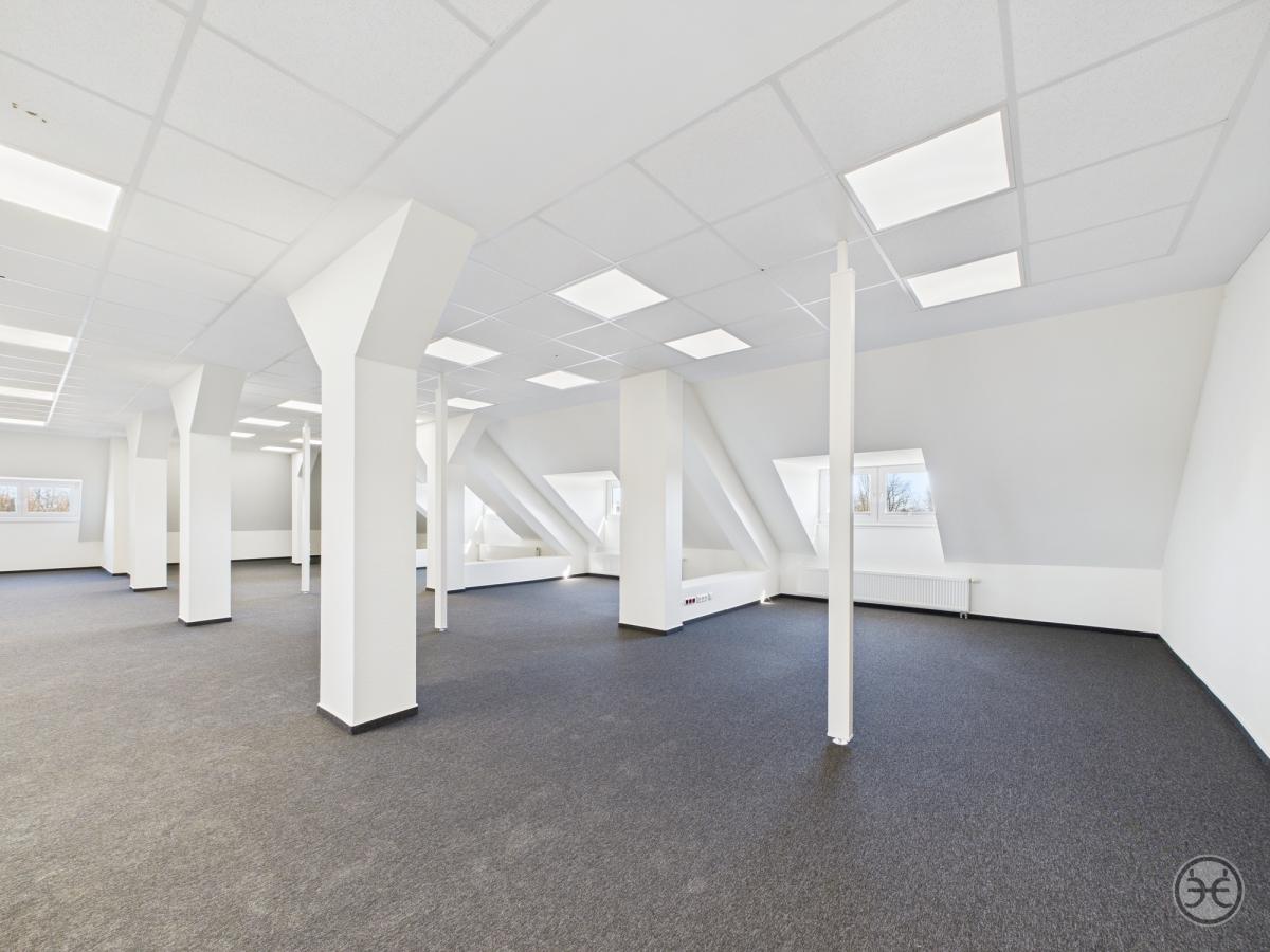 Die Büroflächen sind in einem modernen open-space Ansatz umgesetzt und sind optimal für größere Teams, die zusammenarbeiten sollen. Die sichtbaren, verkleideten Dachkonstruktionen bilden dazu Arbeitsnischen, die auch eine räumliche Trennung der Arbeitsplätze zulassen.