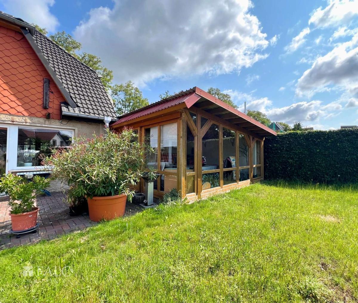 Die Küche ist mit einer großen, funktionalen Einbauküche ausgestattet und bietet genügend Platz für gemeinsame Kochabende. Das Badezimmer ist mit einer ebenerdigen Dusche versehen und liegt in einem kleinen Anbau, der Ihnen zusätzlichen Stauraum oder praktische Nutzflächen bietet. Von dort aus erreichen Sie ebenfalls die Terrasse und den weitläufigen Hofbereich. Ein Highlight im Außenbereich ist der geschützte Wintergarten, der auch an kühleren Tagen ein angenehmes Verweilen ermöglicht. Vom Wintergarten aus gelangen Sie direkt in die angrenzende Garage, die derzeit als Werkstatt, Lagerfläche und Abstellraum genutzt wird.