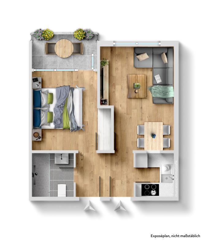 - separates Schlafzimmer mit ausreichend Platz für Doppelbett und Kleiderschrank