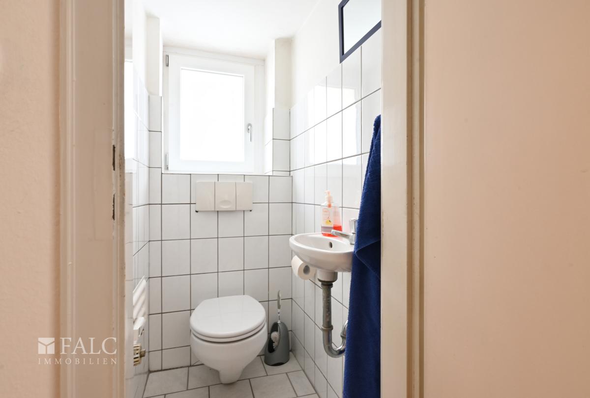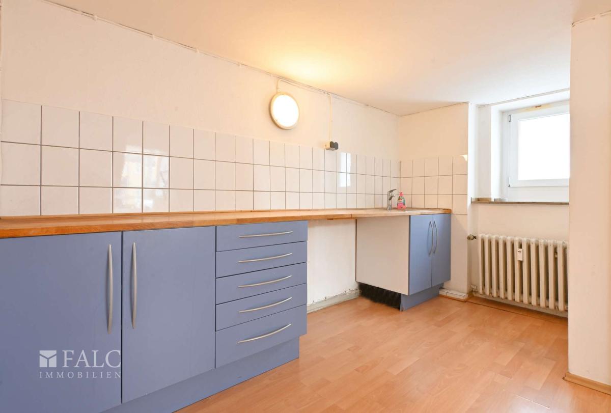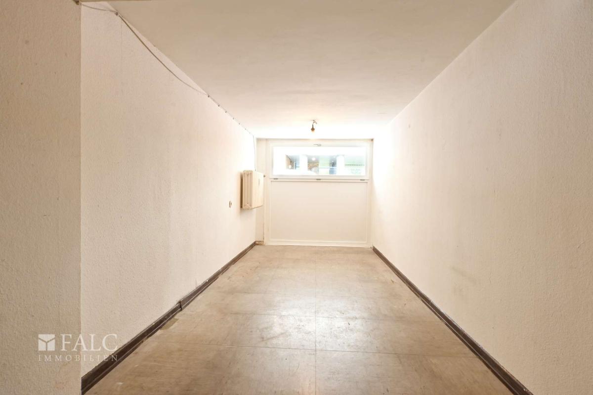Über eine Treppe gelangen Sie vom Empfangsbereich aus in das Untergeschoss. Hier befinden sich eine Küche, ein Lagerraum sowie getrennte WC-Anlagen für Damen und Herren – gut durchdacht für den täglichen Büroalltag.