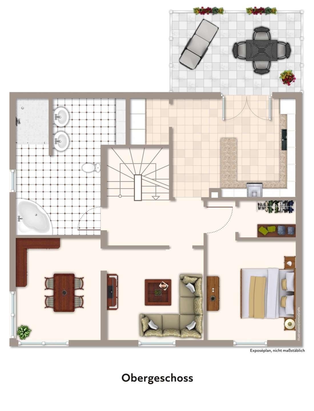 Im Obergeschoss stehen Ihnen ein Schlafzimmer mit Ankleide und ein Wohnbereich mit angrenzendem, lichtdurchflutetem Esszimmer bereit. Weiterhin finden Sie hier ein tolles, modernes Bad mit Walk-in-Dusche, Badewanne und Doppelwaschbecken und eine ansprechende Küche mit Theke und side by side Kühlschrank sowie Zugang zum großzügigen Balkon mit Blick in den Garten.