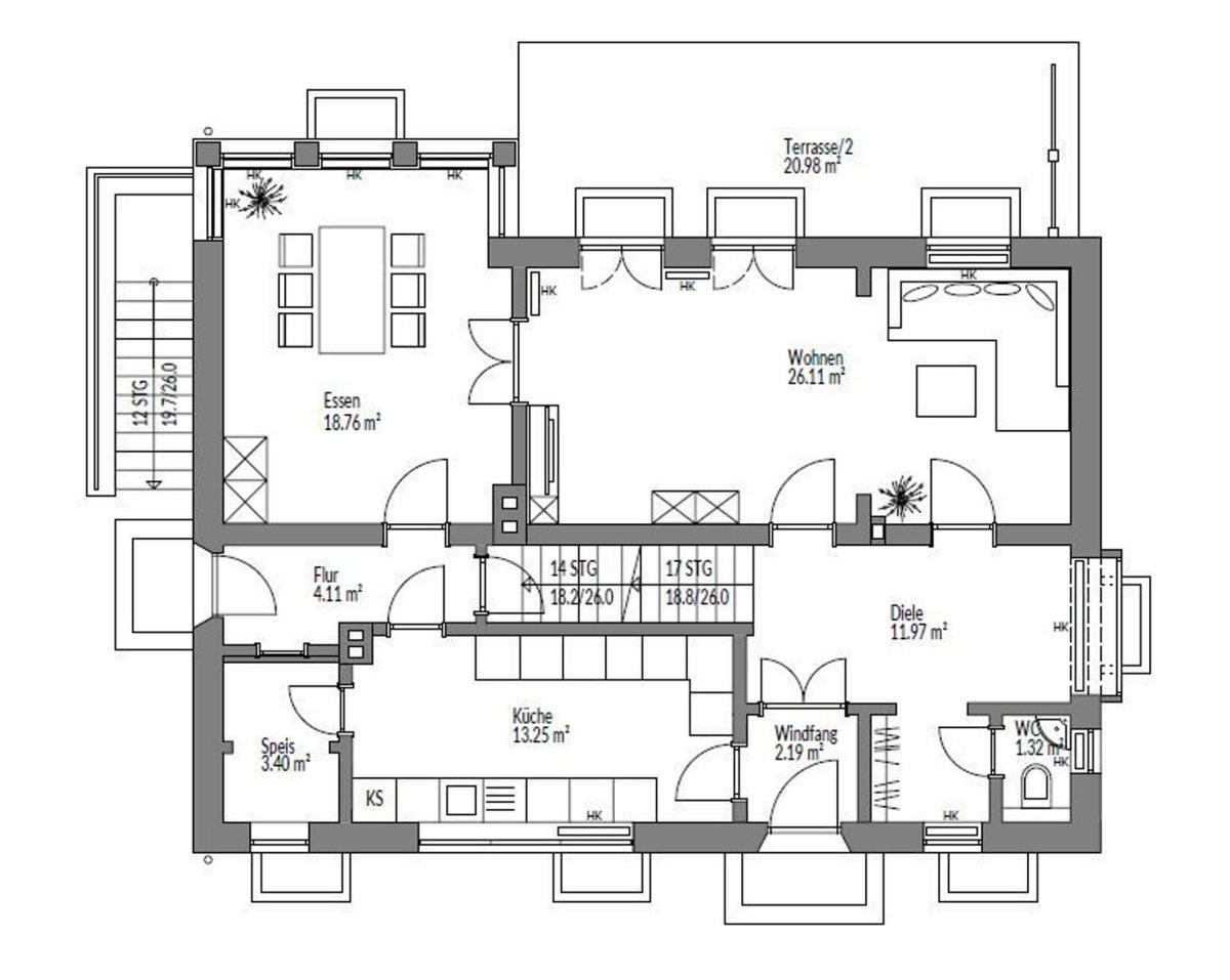 Der gepflegte Außenbereich und die großzügig angelegte Zufahrt vermitteln das Gefühl von Eleganz und Grandezza, welches sich im Inneren fortsetzt. Das stilvolle Entree führt in die harmonisch verbundenen Wohnräume – Küche, Ess- und Wohnzimmer sind durch eine repräsentative Doppelflügeltür verbunden und schaffen ein offenes, kommunikatives Raumgefühl. Ergänzt wird das Raumangebot durch eine praktische Speisekammer, einen separaten Dienstboteneingang, einen Garderobenbereich sowie ein stilvolles Gäste-WC.