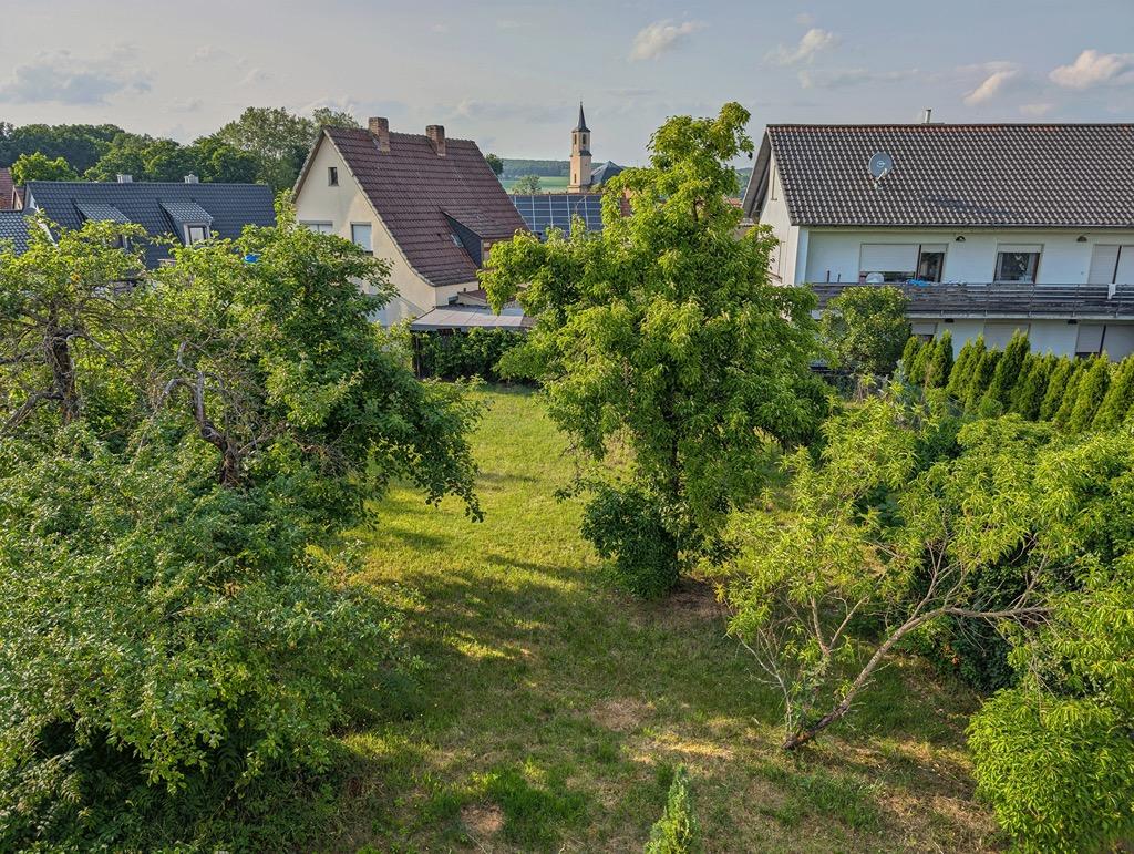 Da die Terrasse zur Südwestseite liegen, kann man dort von morgens bis abends die Sonne genießen und den Garten überblicken mit der Dorfkirche im Hintergrund. Der Garten, der heute eine Wiese ist, kann als Nutzgarten wieder aktiviert werden. Von 1961-1999 wurde der Boden rein biologisch (auch mit Pferdemist) aufgebaut und versorgte die Familie mit Salaten, Gemüse, Spargel, Beeren und Obst. Die stattlichen Obstbäume sind locker verteilt: zwei Apfelbäume, ein Pflaumenbaum, ein Pfirsichbaum und ein Birnbaum.