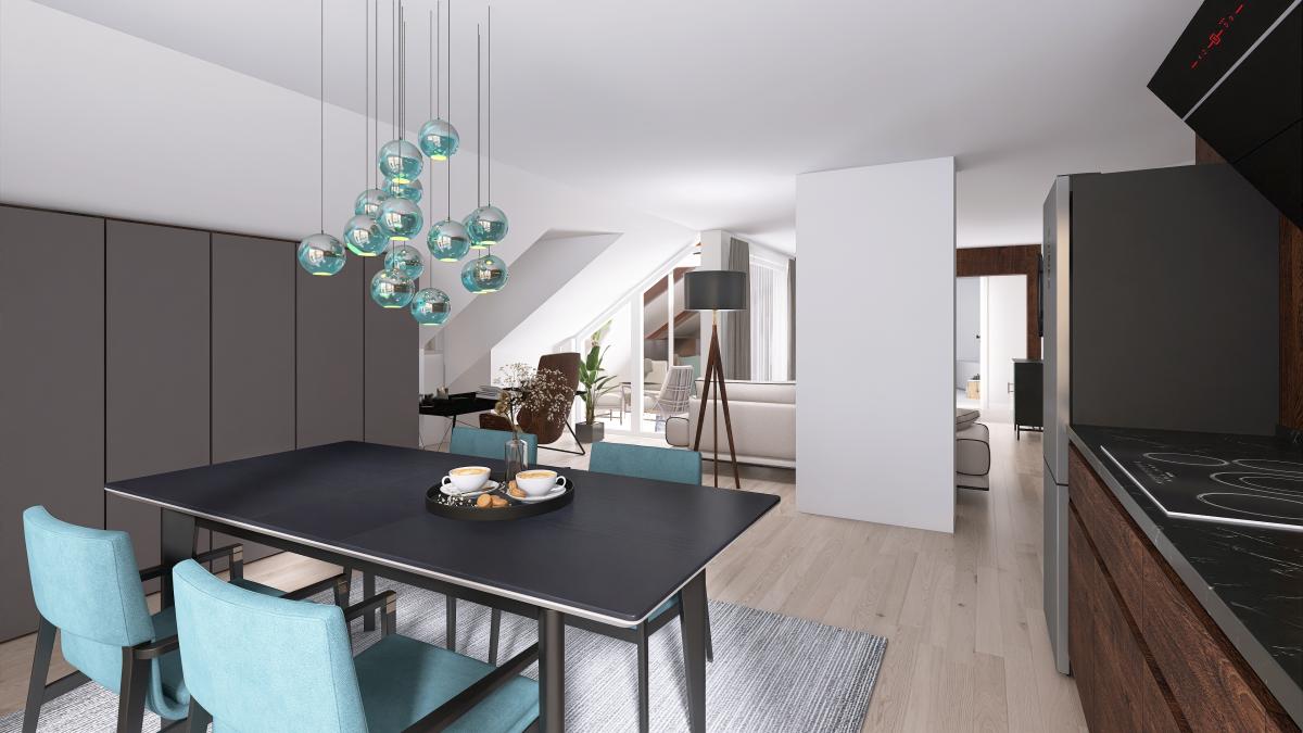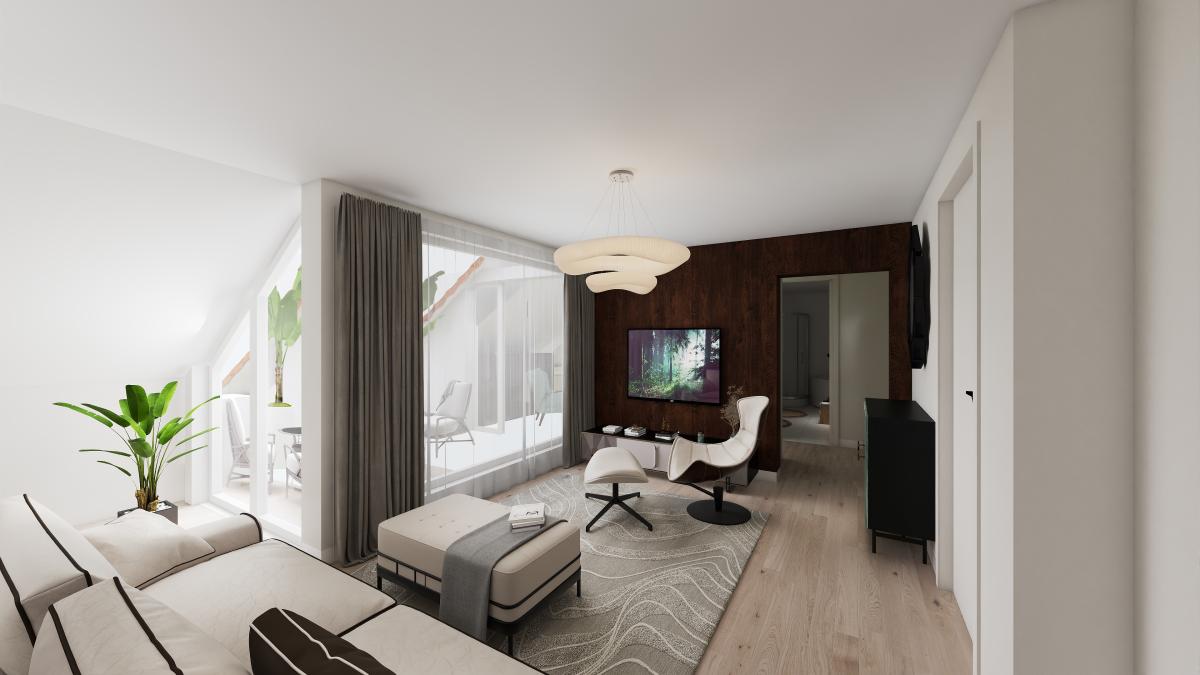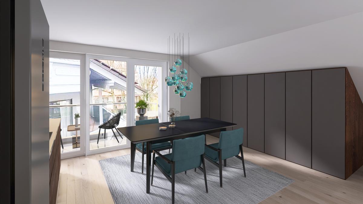 Der großzügige Wohn- und Essbereich ist das Herz dieser 111 m² großen Dachgeschosswohnung. Lichtdurchflutet und offen gestaltet, gelangen Sie von hier aus direkt auf die große Terrasse. Perfekt, um den Tag mit einer Tasse Kaffee zu begrüßen oder den Abend entspannt ausklingen zu lassen. Und für die kurze Frischluftpause nutzen Sie einfach den kleinen Balkon.