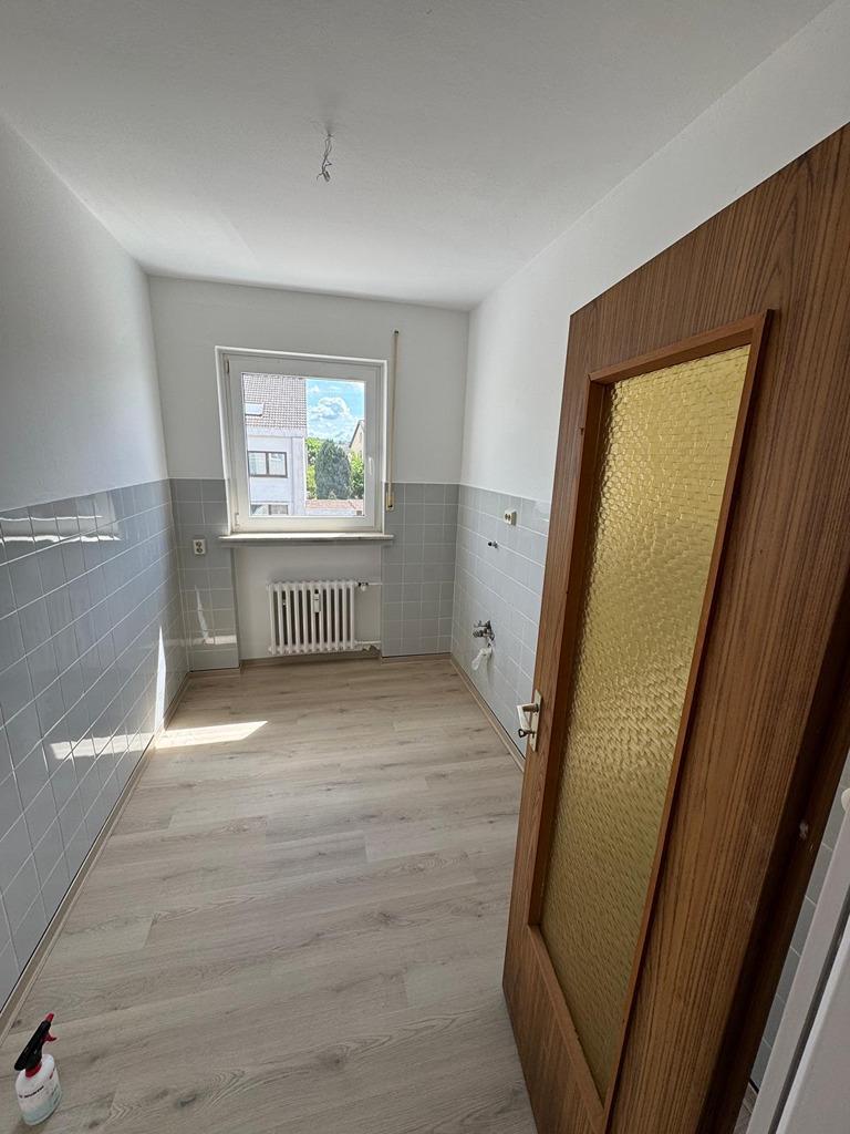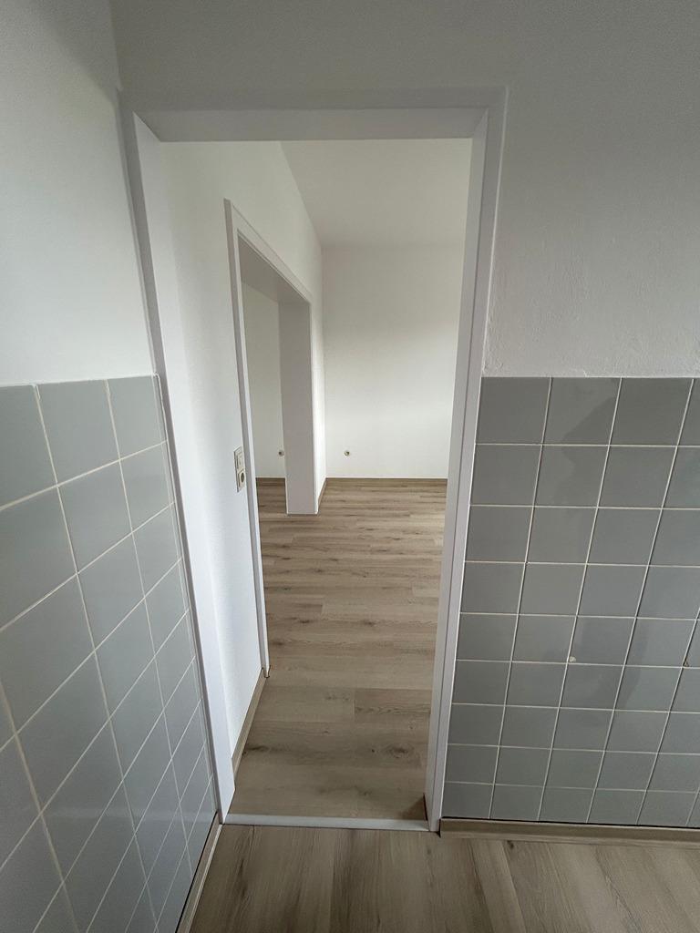 Die frisch renovierte Etagenwohnung verfügt über eine geräumige Küche mit einer hellgrauen Kachelzeile m. Fenster ist unmöbliert. Alle Räume sind mit einem neuen anthrazitfarbenen Vinyl-Fußboden ausgestattet und die Wände sind weiß gestrichen.