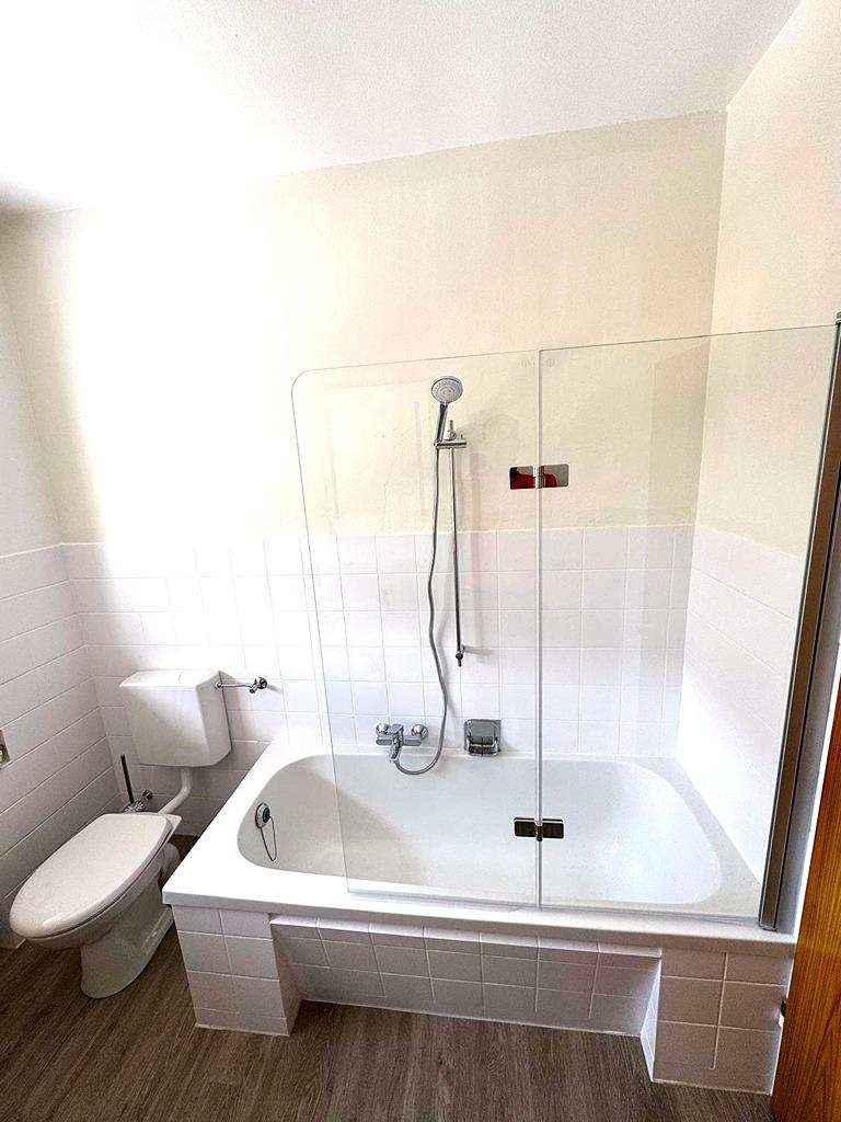 Das Bad ist frisch saniert und verfügt über einen anthrazitfarbenen Boden und hellgraue Kacheln sowie moderner Toilette, großem Waschbecken, beleuchtete Wandspiegel u. Badewanne mit flexiblen Duschabtrennung.
