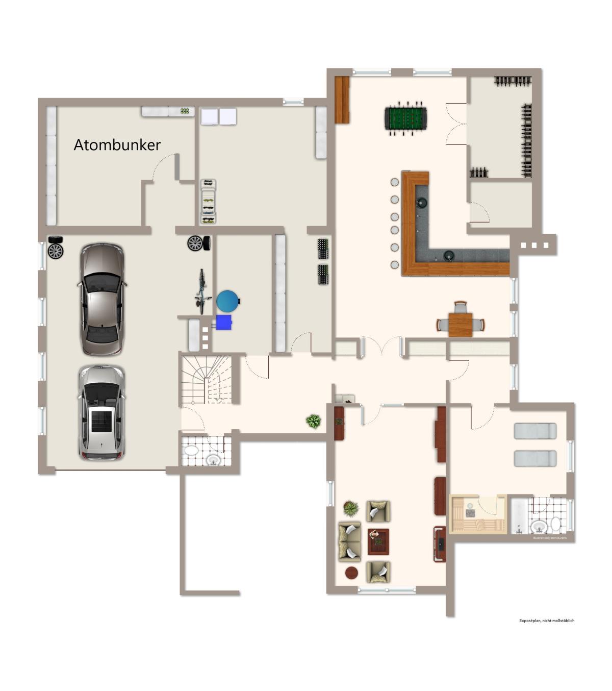 Außerdem befindet sich hier eine große Doppelgarage, von wo aus Sie Zugang zum Atombunker haben (mit Panzertür und manueller Luftzufuhr).