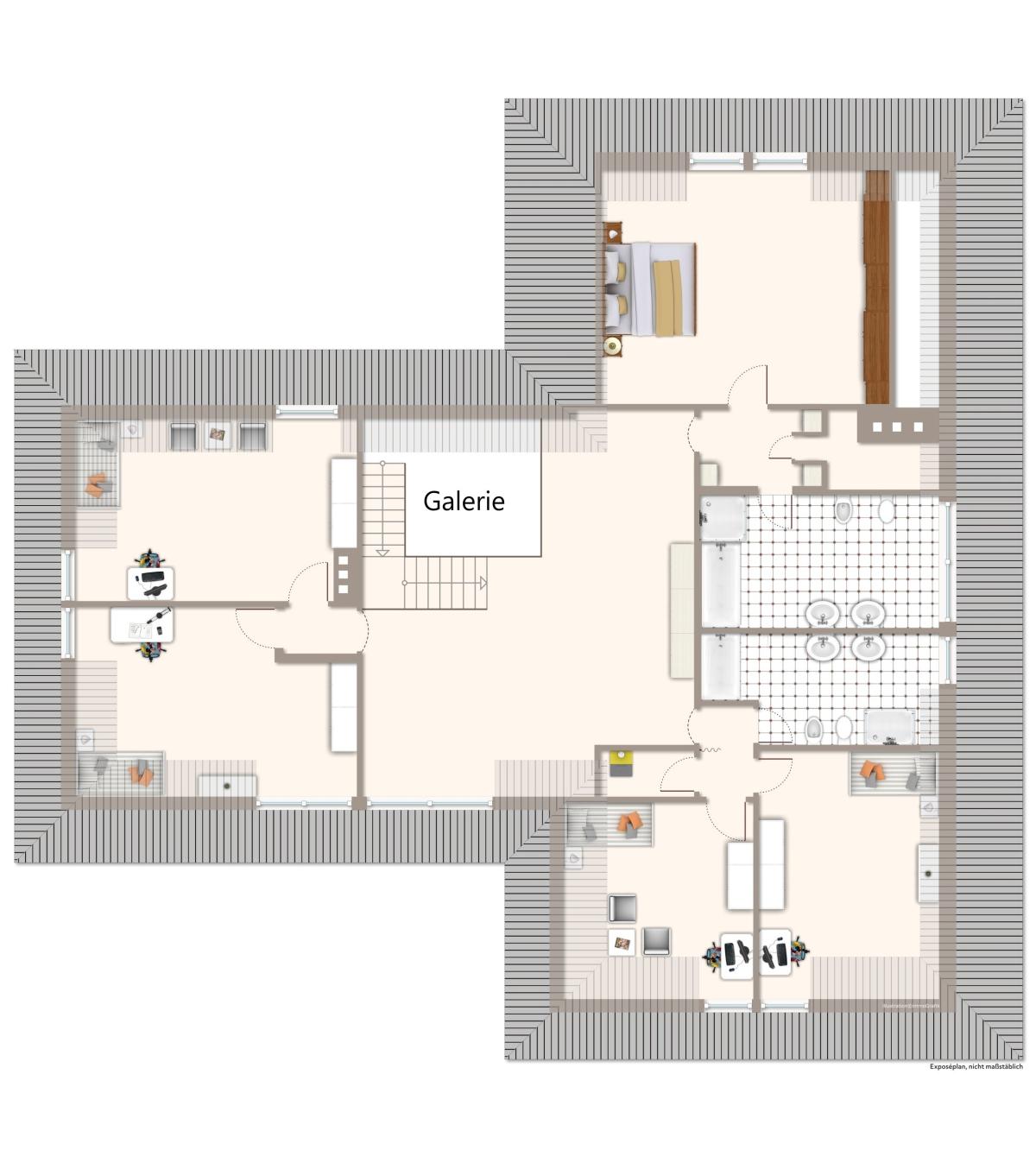 Dachgeschoss: Große Galerie, 5 x Schlafzimmer, 2 Bäder mit jeweils Dusche und Wanne, Heizungsraum mit einzelnen Verteilkreisen für die Fußbodenheizung. Über eine kleine Holztreppe erreichen Sie eine weitere praktische Abstellfäche über den Bädern.