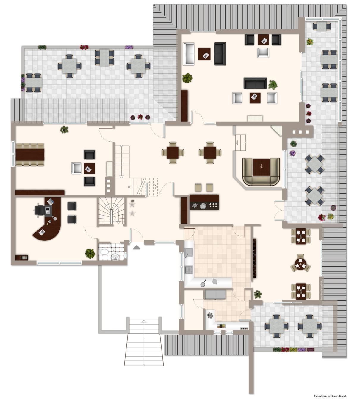 Erdgeschoss: Wohnzimmer, Kaminzimmer, Esszimmer, Büro, Gästezimmer, Küche, HWR mit Nebenküche, Abstellraum, Gäste-WC, Wintergarten. Das Erdgeschoss wird aktuell als Café mit Arbeitsküche genutzt (vorher Wohnzimmer, Kaminzimmer, Küche etc.)