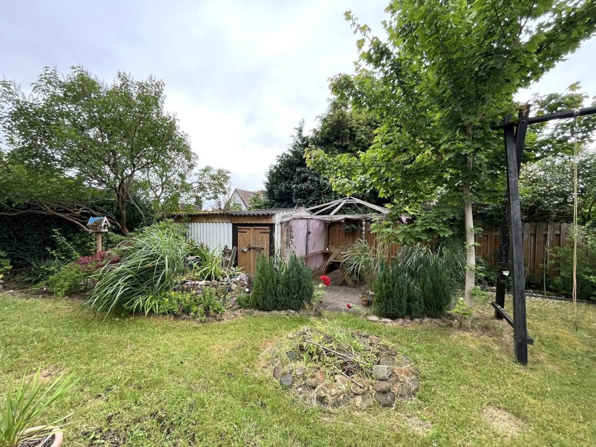 Das vormals objekttypische große Grundstück wurde vor einigen Jahren geteilt. Die Nutz- und Ziergartenanlage liegt mit einer großen Rasenfläche zur Straße und durch hochgewachsene Gehölze blickgeschützt auch seitlich des Hauses. Der Garten ist sowohl klassisch pflegeleicht angelegt - als auch sehr kreativ gestaltet. Es sind verschiedene Freisitzgelegenheiten am Haus und im Garten vorhanden. Der Carport und die Garage mit Schuppen/Unterstand sind entlang der Grundstücksgrenze im baulichen Verbund errichtet.