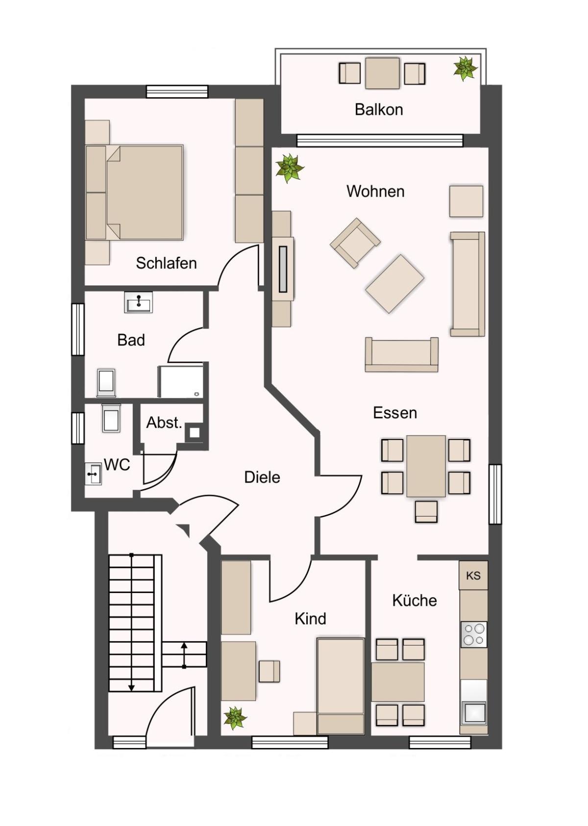 Diele, Kinderzimmer/Büro, Gästetoilette, Badezimmer, Abstellraum, Schlafzimmer, Wohn- und Esszimmer, Küche, Balkon