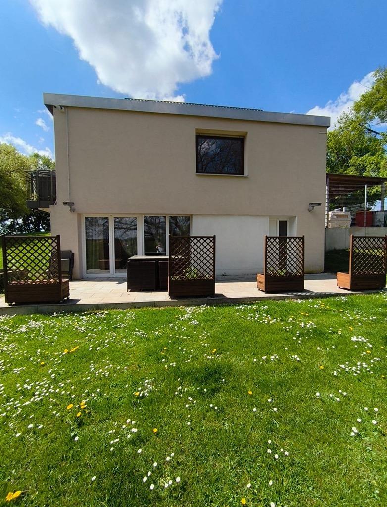 Beim Betreten des Hauses empfängt Sie ein heller Eingangsbereich, der zu allen Räumen führt. Hier befinden sich die mit allen gängigen Elektrogeräten ausgestattete Küche, ein Gäste-WC sowie das großzügige Wohn- und Esszimmer mit Kamin und Freisitz. Vom Wohnbereich aus gelangen Sie direkt auf die Terrasse mit Blick in den weitläufigen Garten. Dieser bietet viel Platz für Entspannung und Aktivitäten im Freien.