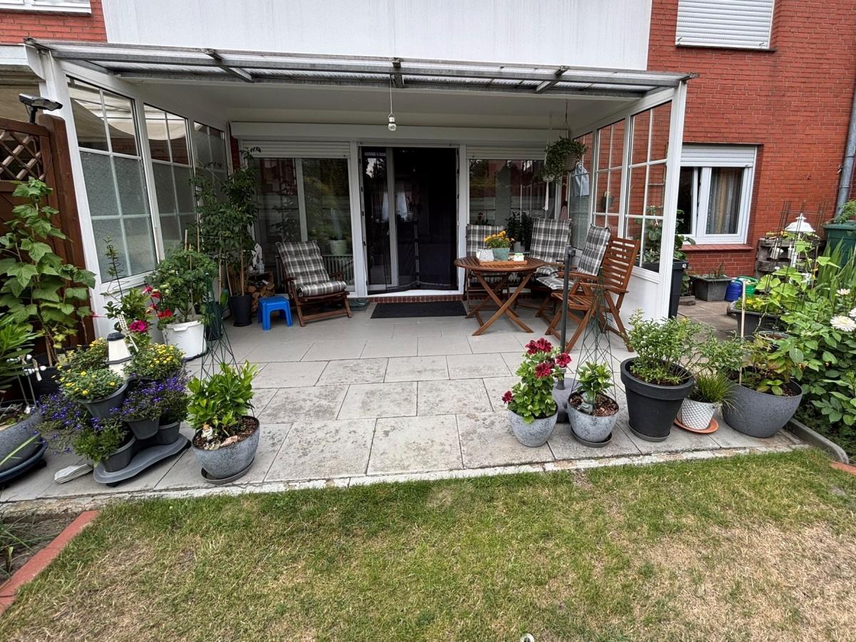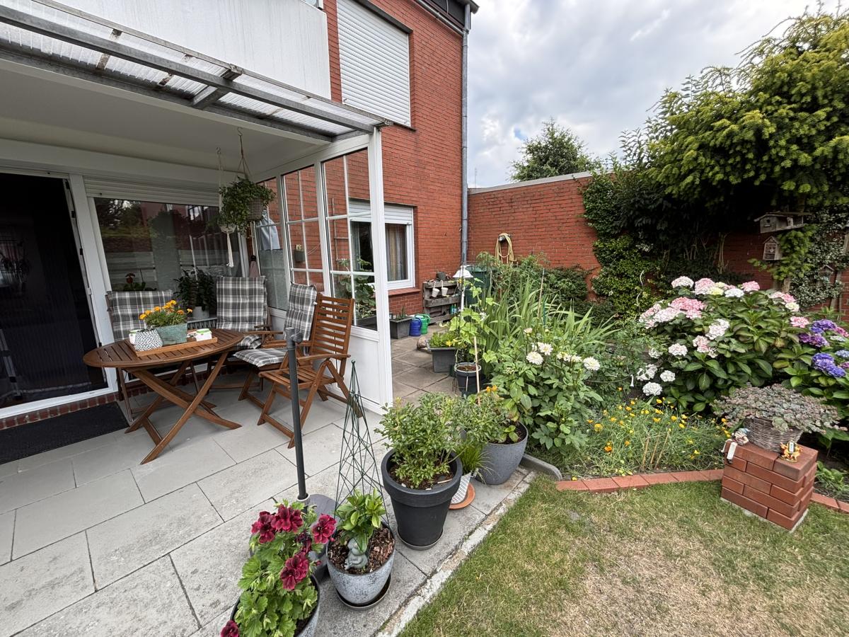 Zur Wohnung gehört ein eigener kleiner Garten sowie eine Terrasse, die größtenteils überdacht ist, so dass Sie sich jederzeit an frischer Luft entspannen können.