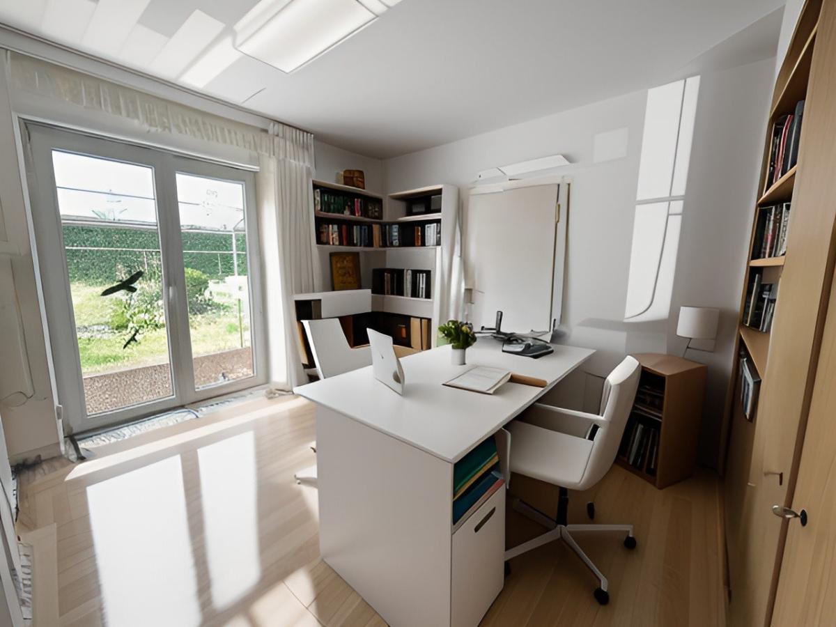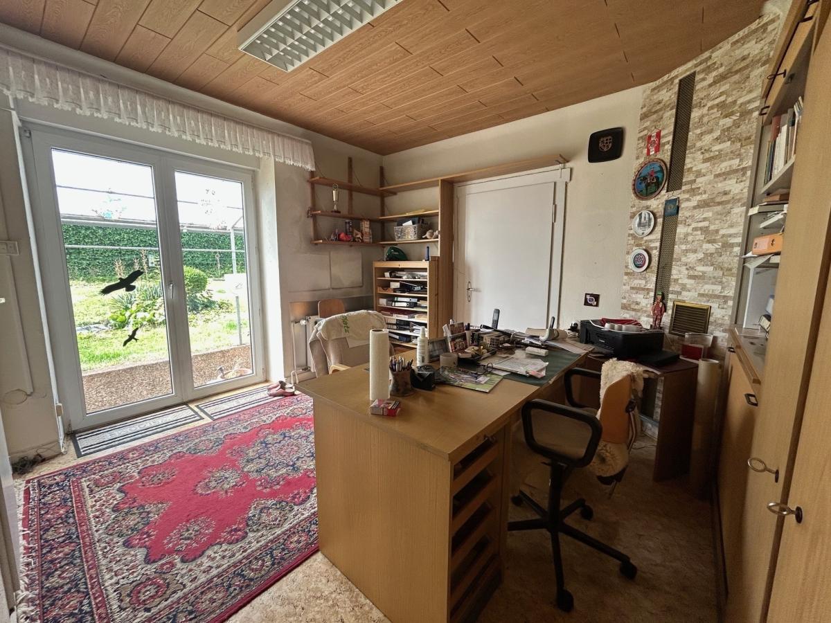 Flur, Küche, Wohn-Esszimmer, Schlafzimmer, Büro mit Zugang zu Terrasse und Garten, Dusch-Bad
