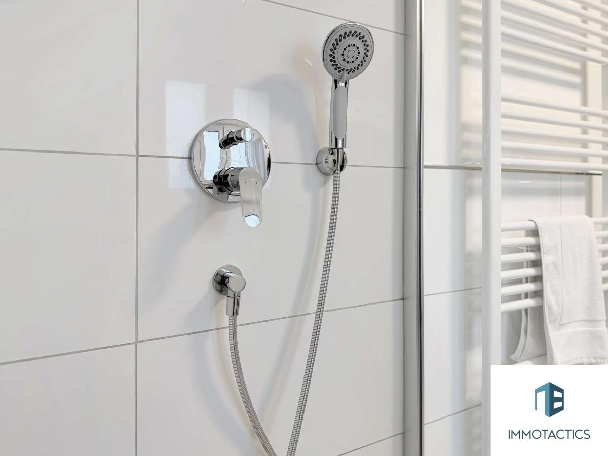 Neues Badezimmer mit frischen Fliesen und Sanitärobjekten (2023)