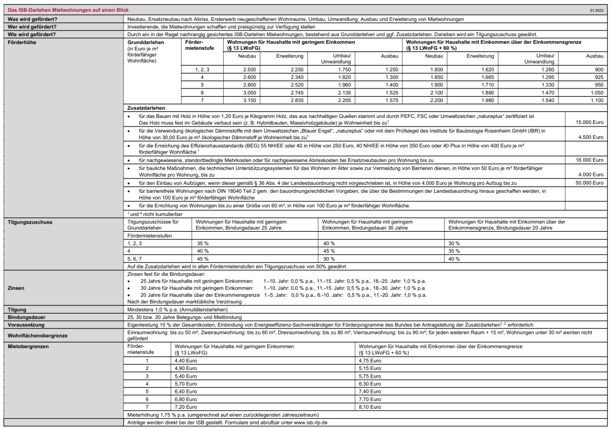 Bei einer Bebauung mit einem Mehrfamilienhaus besteht die Möglichkeit ISB-Förderung: die neu entstehenden Wohnungen durch Mittel der Investitions- und Strukturbank Rheinland-Pfalz (ISB Rheinland-Pfalz) öffentlich zu fördern. Die Details sind im Programm 551