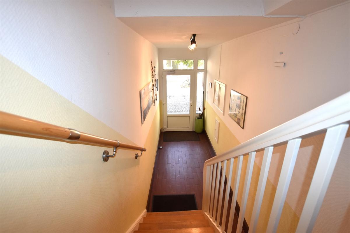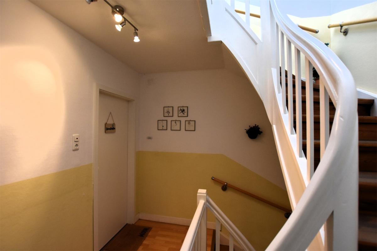 Eine massive geschwungene Holztreppe führt durch das gemütliche Treppenhaus in die im ersten Obergeschoss gelegene Wohneinheit. Durch die Wohnungseingangstüre gelangen Sie in einen hellen Flur, aus dem Sie alle Räume erreichen.